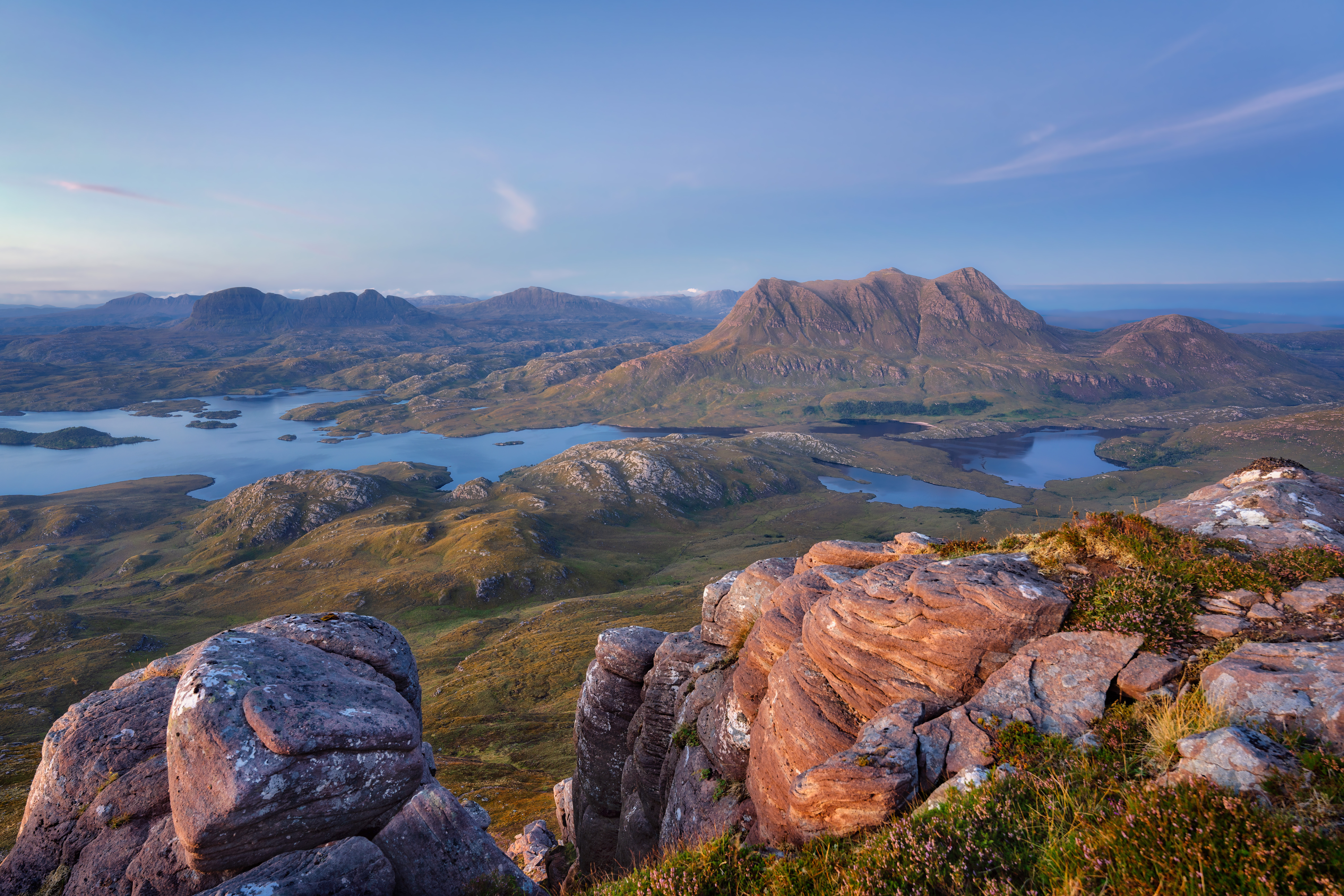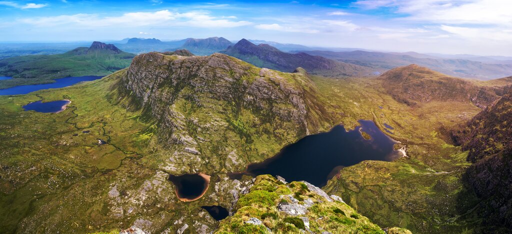 Auf 765 Metern eröffnet sich ein 360-Grad-Panorama: Wir blicken über die zerklüftete Küste von Wester Ross, die Gipfel von Assynt, die Isle of Skye und die Hebriden im Westen. An klaren Tagen reicht der Blick sogar bis zu den fernen Cairngorms. Die charakteristische Form des Berges, die an eine aufrechte Geige erinnert, wird vom Gipfel aus besonders deutlich.