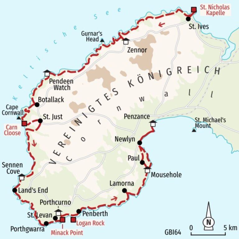 Wanderreise entlang Englands Südwestküste auf dem South West Coast PathGoldene Sandstrände, schroffe Felsklippen und das stetige Rauschen des Meeres begleiten Sie auf dieser Trekkingreise entlang des South West Coast Path – einem der schönsten Küstenwanderwege Europas. In sechs leichten Etappen erkunden Sie die südwestlichste Spitze Englands: von St. Ives, dem charmanten Künstlerstädtchen mit mediterranem Flair, führt Ihr Weg über einsame Buchten und sanfte Klippenpfade bis nach Newlyn. Unterwegs tauchen Sie in die Sagenwelt Cornwalls ein, entdecken keltische Steingräber, alte Schmugglerverstecke und genießen atemberaubende Ausblicke – besonders am westlichsten Punkt Englands, dem legendären Land’s End.