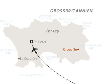 <Flug nach Jersey. Bei Buchung des Fluges über ASI Reisen wirst du am Flughafen von einem ASI Vertreter abgeholt und in unser Hotel gefahren.