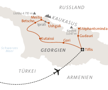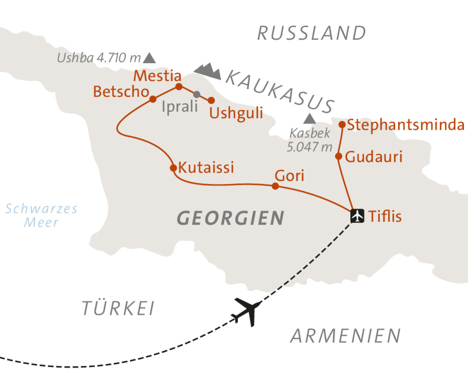 <Das Abenteuer beginnt mit dem Flug nach Tiflis. Je nach Flugplan kann die Ankunft auch erst in den frühen Morgenstunden des Folgetages erfolgen. Am Flughafen wirst du von einem ASI-Vertreter begrüßt und zu unserem komfortablen Hotel gebracht. Da die Ankünfte unterschiedlich sind, findet die offizielle Begrüßung durch unseren Guide und das erste Kennenlernen der Gruppe erst am nächsten Tag statt.