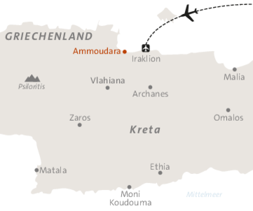 <Flug nach Kreta. Am Flughafen wirst du von einem ASI Vertreter abgeholt und in das Hotel gefahren.