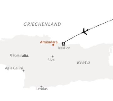 <Flug nach Heraklion und Fahrt ins Hotel. Abends findet ein Willkommenstreffen mit dem Reiseleiter und eine kurze Besprechung der E-Bike-Touren statt.