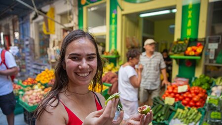 <Kalimera! Willkommen in Griechenland. Dein Abenteuer beginnt mit einem Willkommenstreffen um 16 Uhr im Restaurant De-Tox Café in Marina Tourlos. Die erste Anlaufstelle ist der örtliche Supermarkt, um Vorräte für eure Gruppenreise zu kaufen. Das Starterpaket enthält Proviant für Frühstück, Mittagessen und/oder Snacks. Wenn du besondere Ernährungsbedürfnisse hast, solltest du uns das bei der Buchung mitteilen, damit wir deine Wünsche berücksichtigen können. Vor oder nach dem Treffen kannst du Mykonos erkunden oder an einem der Sandstrände der Insel entspannen. Vielleicht besuchst du die Kirche Panagia Paraportiani oder stöberst in den Galerien, Restaurants und Boutiquen. Warum schnappst du dir heute Abend nicht deine Mitreisenden und schlenderst nach Klein-Venedig, um bei Sonnenuntergang einen Cocktail am Wasser zu genießen?
