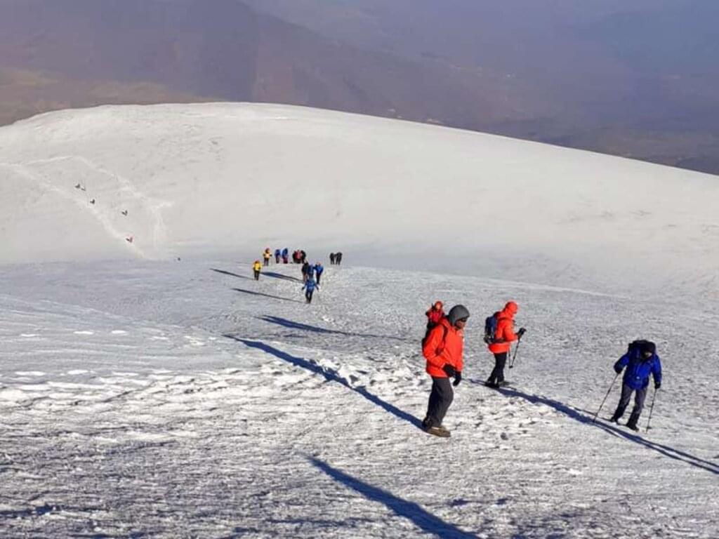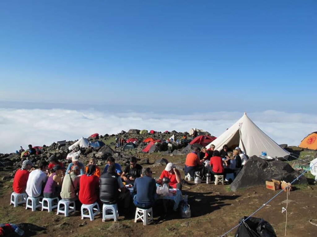<Heute ziehen wir ins Hochlager um. Die Tragetiere werden erneut mit unserem Gepäck beladen. Wir starten nach dem Frühstück mit leichtem Gepäck und steigen abermals zum Hochlager auf. Den Rest des Tages ruhen wir uns aus und bereiten uns für den morgigen Gipfeltag vor. -