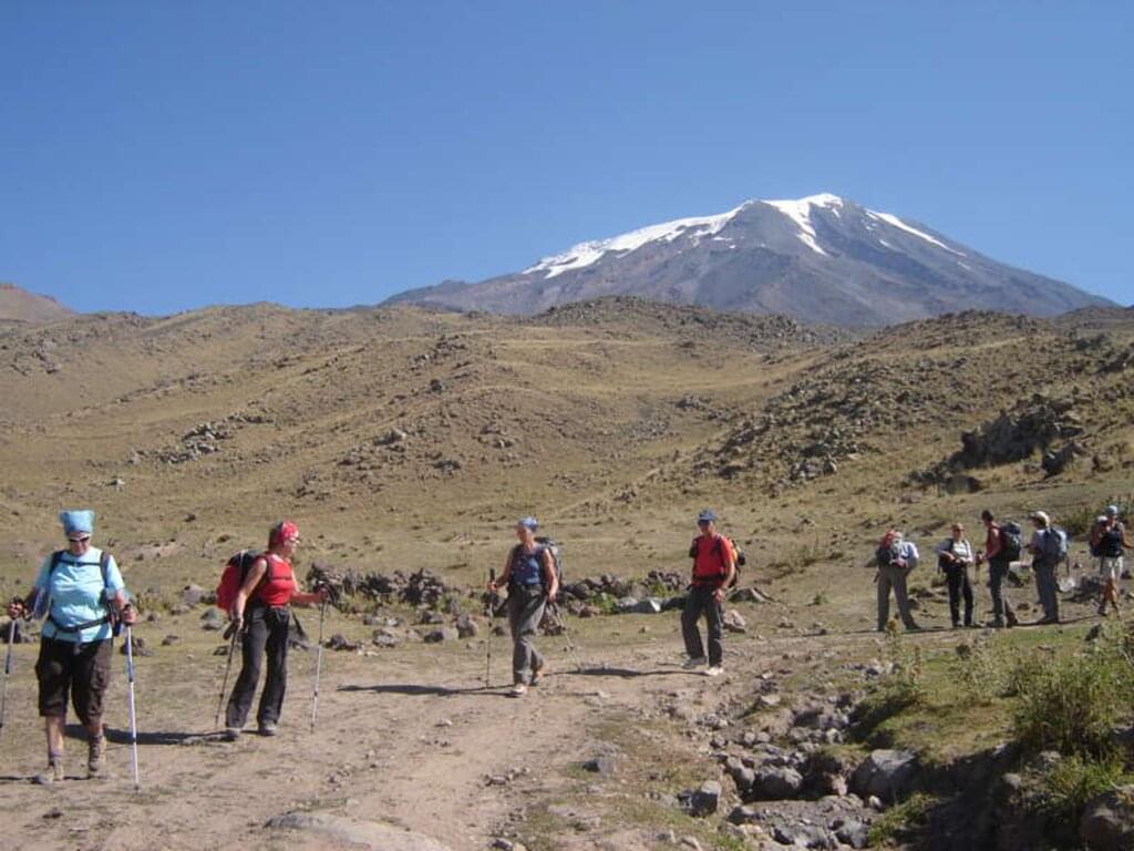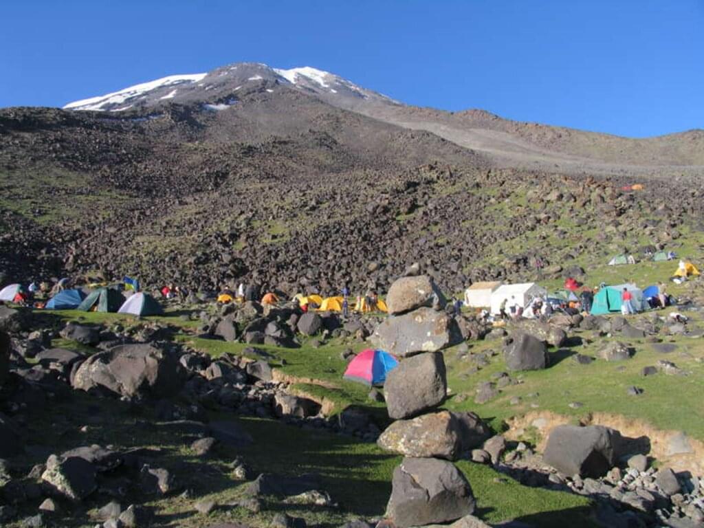 <Heute startet unser Trekking auf den Ararat. Auf dem Weg zum Ausgangspunkt der Besteigung, auf ca. 2.200 m, halten wir an der Militärstation kurz hinter Dogubeyazit. Hier wird unser Besteigungsvisum überprüft und die Besteigung offiziell registriert. Nach insgesamt etwa 1 Stunde Fahrt erreichen wir das Ende der Fahrstraße, hier wartet die kurdische Begleitmannschaft mit Pferden und/oder Mulis auf uns. Sobald das Gepäck auf die Tiere gebunden ist, steigen wir über Wiesenpfade hinauf zum Basislager, das landschaftlich sehr schön an den Hängen des Ararat liegt. Dort essen wir auch zu Abend. -