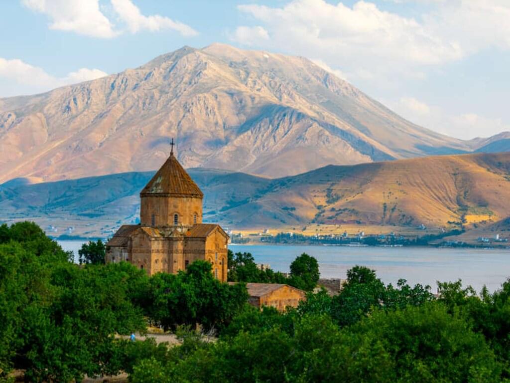 <Am Vormittag setzen wir über zur Insel Akdamar im Van-See und besuchen die Heiligkreuzkirche. Im Anschluss fahren wir entlang des Van-Sees und durch vulkanisches Gebiet Richtung Dogubeyazit nahe der iranischen Grenze. Bereits kurz vor unserem heutigen Ziel taucht der Ararat majestätisch vor uns auf. In Dogubeyazit besichtigen wir den Ishak Pasa Sarayi - eine Mischung aus Bergfestung und orientalischem Lustschloss. Danach beziehen wir unsere Zimmer und treffen uns zum Abendessen wieder. -
