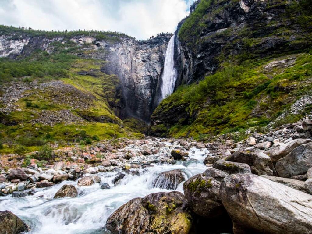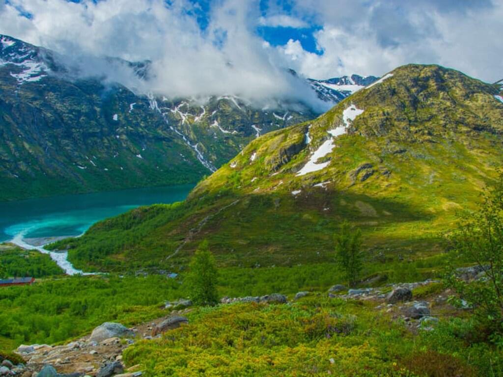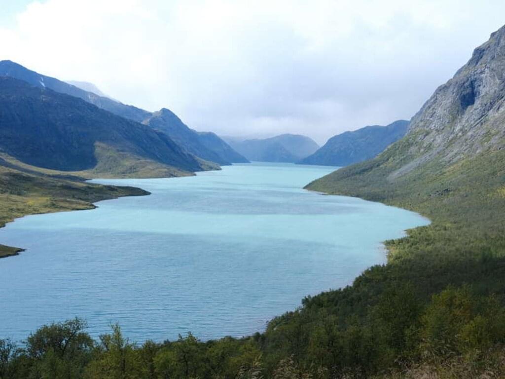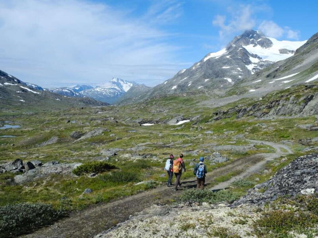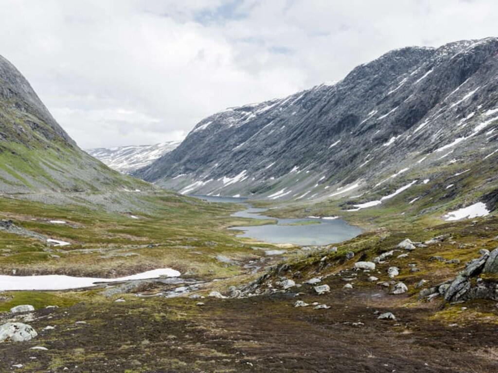 <Am Morgen setzen wir mit dem Boot von Memurubu nach Gjendebu über (ca. 30 min.). Wir lassen den Gjende-See hinter uns und wagen uns tiefer in die Bergwelt von Jotunheimen vor. Immer am Fluss Storåe entlang, wandern wir in gleichmäßigem bergauf durch das Tal Storåedalen. Je nach Wasserstand ist hin und wieder einer der Nebenbäche zu queren. Sind die Berghänge und Wiesen um uns herum zunächst noch von Birkenwäldern und Heidekraut bedeckt, wird die Landschaft allmählich kahler, der Pfad felsiger, die Berge schroffer und zunehmend von Schneefeldern überzogen. Wir passieren kristallklare Bergseen und haben das Herz des höchsten Gebirge Norwegens erreicht. An einem See und umringt von zahlreichen Gipfeln und Gletschern übernachten wir in der Berghütte Leirvassbu. -