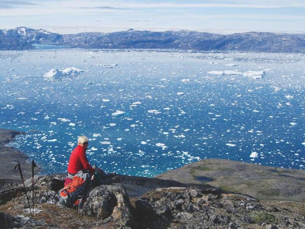 <Vor uns liegt der Hausberg von Tasiilaq - und wir wollen hinauf. Nachdem wir die Siedlung hinter uns gelassen haben, wandern wir an eisigen Gebirgsbächen und grünen Wiesen vorbei durch das Blumental. Die liebliche Landschaft wird aber schnell rauer und erst ein teilweise recht steiler Anstieg über wegloses Blockgelände führt uns zum Gipfel des Qaqertivagajik. Was für ein Schauspiel - unter uns treibt der größte Eisstrom der Erde gigantische Eisberge durch das Wasser. Die bizarren Formen lassen unserer Fantasie freien Lauf, bei gutem Wetter sehen wir die Eisschollen bis zu 150 km weit in der Sonne blitzen. Es lohnt sich aber auch, einen Blick nach Norden zu werfen. Tasiilaq schlummert wie eine bunt gewürfelte "Spielzeugwelt" am blauen Fjord. Und im Westen? Ganz in der Ferne entdecken wir das Inlandeis zwischen den gezackten Bergkuppen. Wir lassen die Eindrücke in Ruhe auf uns wirken, bevor wir zurück wandern. -