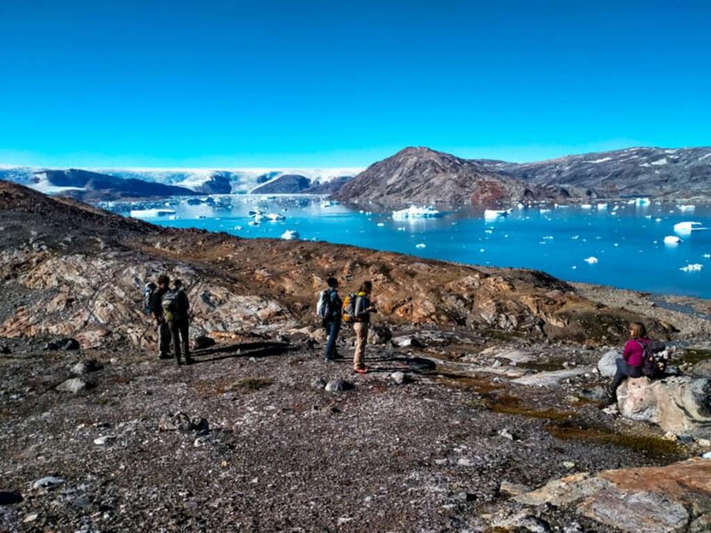 <Nach dem Frühstück packen wir unseren Tagesrucksack und unser Ziel des heutigen Tages haben wir bereits fest im Blick. Hinter unserem Camp thront der mächtige Hausberg des Sangmileq-Fjords. Östlich des Bachs steigen wir langsam durch eine breite Felsrinne aufwärts. Unter Umständen queren wir hier noch Schneefelder, während die Aussicht immer beeindruckender wird. Unter uns dümpeln die Eisschollen im Fjord und dahinter ragen die felsigen Zacken aus den unendlichen Gletscherlandschaften empor. Wir erreichen den Sattel zwischen den Felsen und biegen zum linken Gipfel ab. Nur noch wenige Höhenmeter über große Felsblöcke und Schotter und wir genießen den Ausblick auf die arktische Landschaft. Wir nehmen uns Zeit für diesen Moment, bevor es uns wieder zurück ins Camp zieht. -
