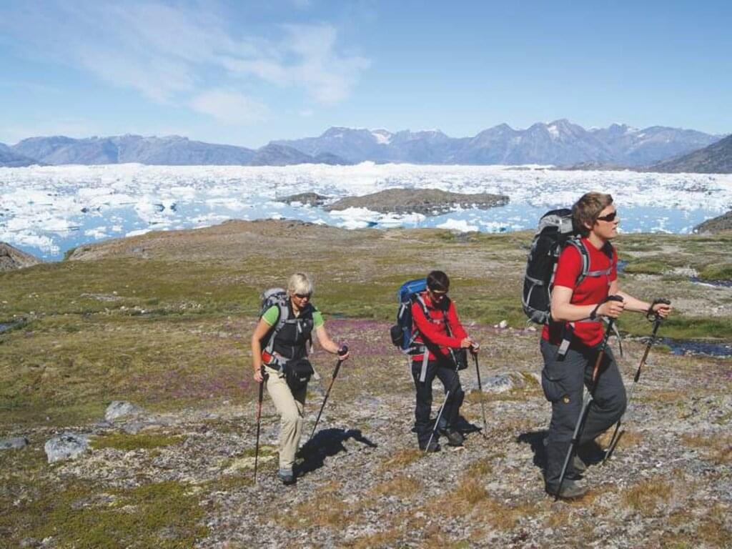 <Vor uns liegt der Hausberg von Tasiilaq - und wir wollen hinauf. Nachdem wir die Siedlung hinter uns gelassen haben, wandern wir an eisigen Gebirgsbächen und grünen Wiesen vorbei durch das Blumental. Die liebliche Landschaft wird aber schnell rauer und erst ein teilweise recht steiler Anstieg über wegloses Blockgelände führt uns zum Gipfel des Qaqertivagajik. Was für ein Schauspiel - unter uns treibt der größte Eisstrom der Erde gigantische Eisberge durch das Wasser. Die bizarren Formen lassen unserer Fantasie freien Lauf, bei gutem Wetter sehen wir die Eisschollen bis zu 150 km weit in der Sonne blitzen. Es lohnt sich aber auch, einen Blick nach Norden zu werfen. Tasiilaq schlummert wie eine bunt gewürfelte "Spielzeugwelt" am blauen Fjord. Und im Westen? Ganz in der Ferne entdecken wir das Inlandeis zwischen den gezackten Bergkuppen. Wir lassen die Eindrücke in Ruhe auf uns wirken, bevor wir zurück wandern. -
