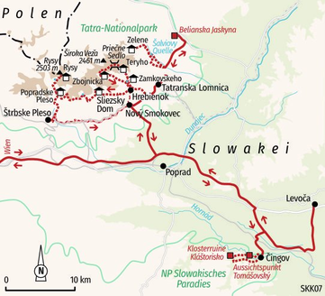 Standort-Wanderreise mit Wanderungen im Nationalpark Hohe Tatra und im Slowakischen ParadiesSteile Felswände bestimmen das Landschaftsbild. Die kargen Spitzen ragen in den Himmel, die grünen Sockel scheinen im klaren Wasser der Bergseen zu zerfließen. Am Ufer wachsen Bäume und Sträucher, die Luft ist klar und frisch. Das Pfeifen der Murmeltiere durchbricht die Stille. Schnell verwandelt sich das sanfte Hügelland wieder in scharfkantige Gipfel, die nur noch eine karge Vegetation vorweisen. Die Hohe Tatra ist ein geheimes Paradies – für Gämse, Luchse und Wölfe, aber auch für Wanderer und Bergsteiger. Wir beziehen unser Quartier am Fuße der Berge und erkunden von dort das "kleinste Hochgebirge der Welt". Wir wandern durch dichten Mischwald, über blühende Bergwiesen und durch den botanischen Garten des Nationalparks, wir überqueren steile Pässe, rasten an rauschenden Wasserfällen und picknicken in urigen Berghütten. Wir erkunden die Mini-Alpen aber nicht nur überirdisch, sondern wagen in der Tropfsteinhöhle Belianska Jaskyna sogar einen Blick in die Erde hinein. Mit etwas tierischem Glück entdecken wir sogar die Spuren von Bären zwischen den Bäumen oder hören das Schnalzen der Auerhähne beim Balzen! Die Tatra ist zwar klein, aber bietet dennoch das gesamte Natur-Repertoire der Alpen auf engstem Raum: Die Wege sind vielseitig, mal ausgewiesen, mal ausgesetzt, auf jeden Fall aber aussichtsreich und mit einer Ruhe versehen, die sonst kaum noch zu finden ist. Und wenn der Hunger ruft, dann stärken wir uns mit Brimsenkäse, Palatschinken und Piroggen – so geht Bergsteigen auf Slowakisch.