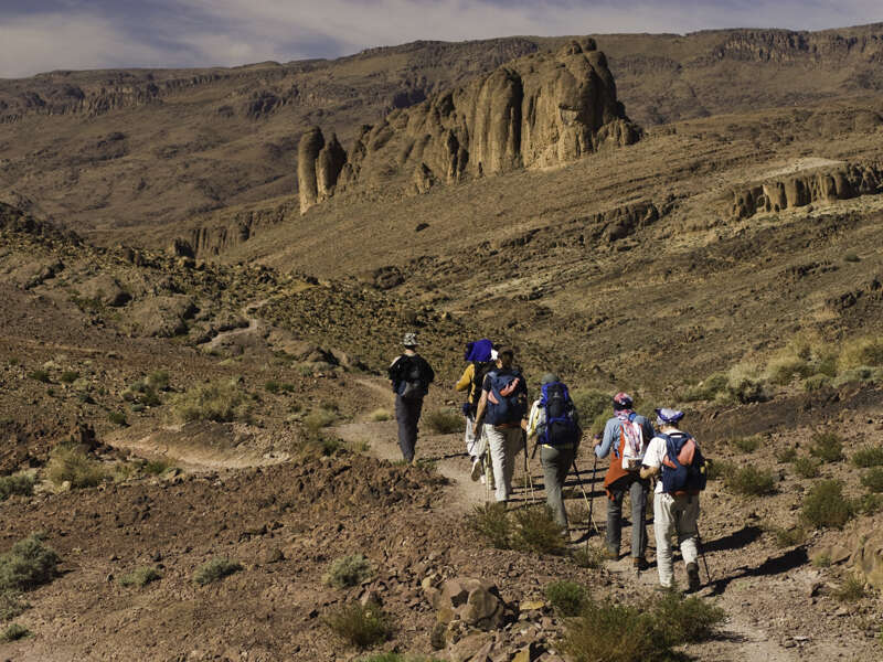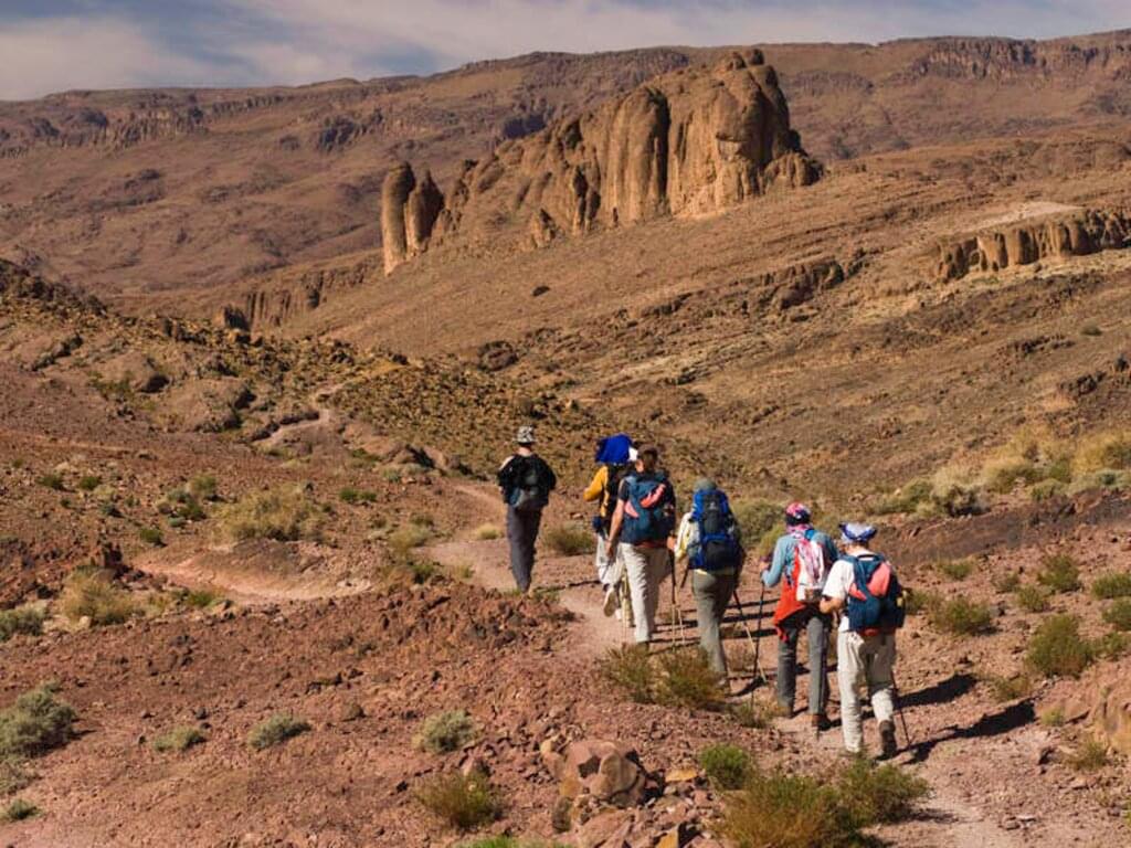<Über ein Plateau wandernd ist unser erstes Ziel der Aussichtsberg Kouaouch (2.592 m). Der Gipfel bietet eine Rundumsicht ins Saghro-Gebirge und auf den Hohen Atlas. Wir wandern zwischen gewaltigen Tafelbergen mit bizarren Erosionsformen hindurch. Schließlich treffen wir in der Oase Igli (1.700 m) ein und schlagen, von einer Felskulisse umgeben, die Zelte auf. Diese Region ist zeotweise von Nomadenfamilien besiedelt, die in dem kargen Weideland von der Schaf- und Ziegenzucht leben. -