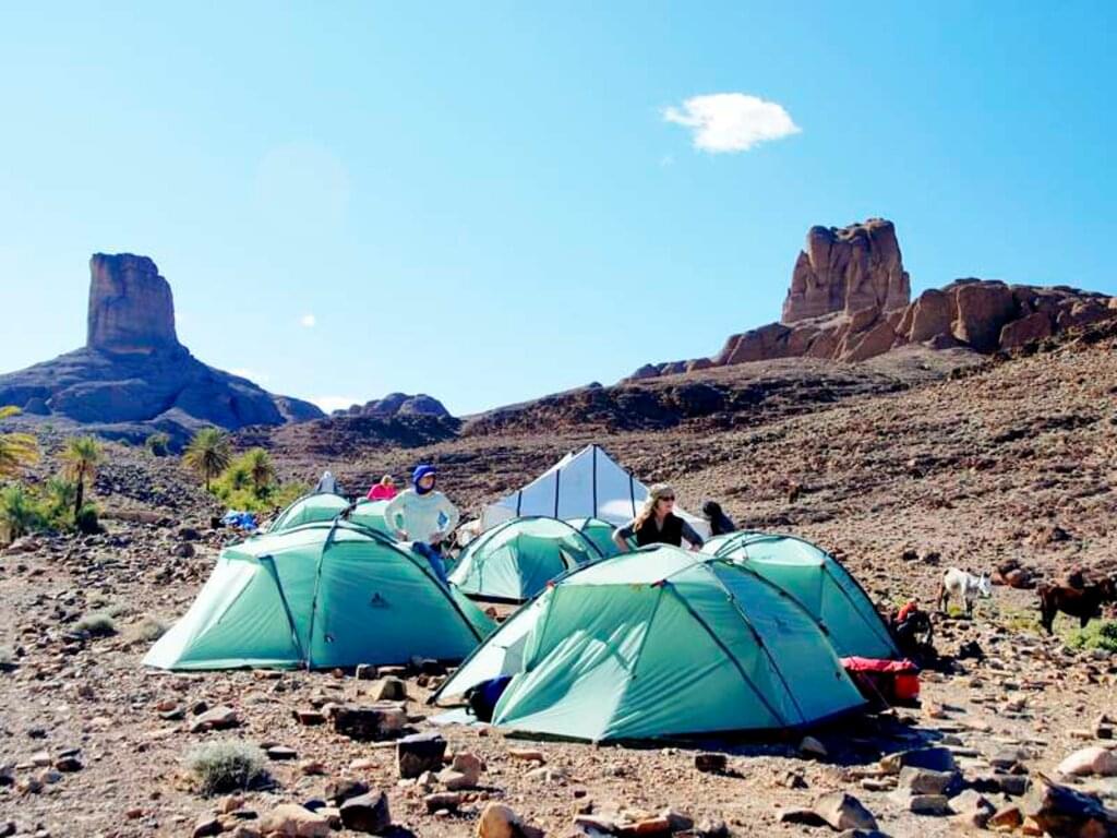 <Morgens beladen die Mulitreiber ihre Tiere mit unserem Gepäck sowie der Zelt- und Kochausrüstung. Dann brechen wir zum viertägigen Bergtrekking auf. Der Djebel Saghro erstreckt sich südlich der Straße der 1.000 Kasbahs zwischen dem Oasental des Drâa im Westen und dem Oasengebiet von Tafilalet im Osten und geht nach Süden in die Kies- und Schotterwüsten der Sahara über. Nach zuerst mäßigem Anstieg geht es einen Serpentinen-Weg hinauf. Wir verbringen unsere Mittagspause mit Blick auf die Berge des Hohen Atlas. Bergan wandern wir zum Tizi-n-Iferd (2.500 m, Tizi = Pass), bald wird die Sicht frei auf den höchsten Berg im Saghro-Massiv, der Amalou n'Mansour (2.712 m). Wir steigen aber nicht weiter auf, sondern bergab zu unserem Lagerplatz (2.200 m) nahe einer kleinen Quelle. -