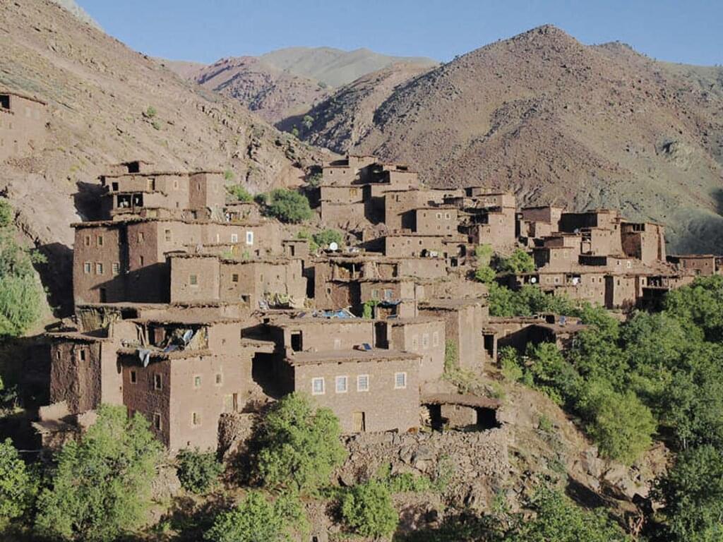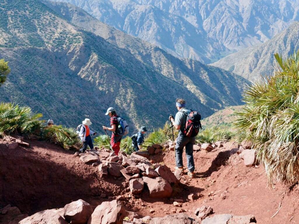 <Wir verlassen das Melloul-Tal und steigen auf einem Serpentinenweg hinauf zum Tizi-n-Dari (1.970 m, Tizi = Pass). Anschließend steigen wir ab zum Dorf Ait Boulmane und trinken vielleicht bei einer Berberfamilie einen Thé à la Menthe, den typischen, marokkanischen Pfefferminztee. Entlang der Asif Melloul-Schlucht erreichen wir dann unsere Gîte (1.520 m). Den Rest des Tages haben wir frei, um die reizvolle Schlucht zu erkunden oder zum Entspannen und Erholen. -