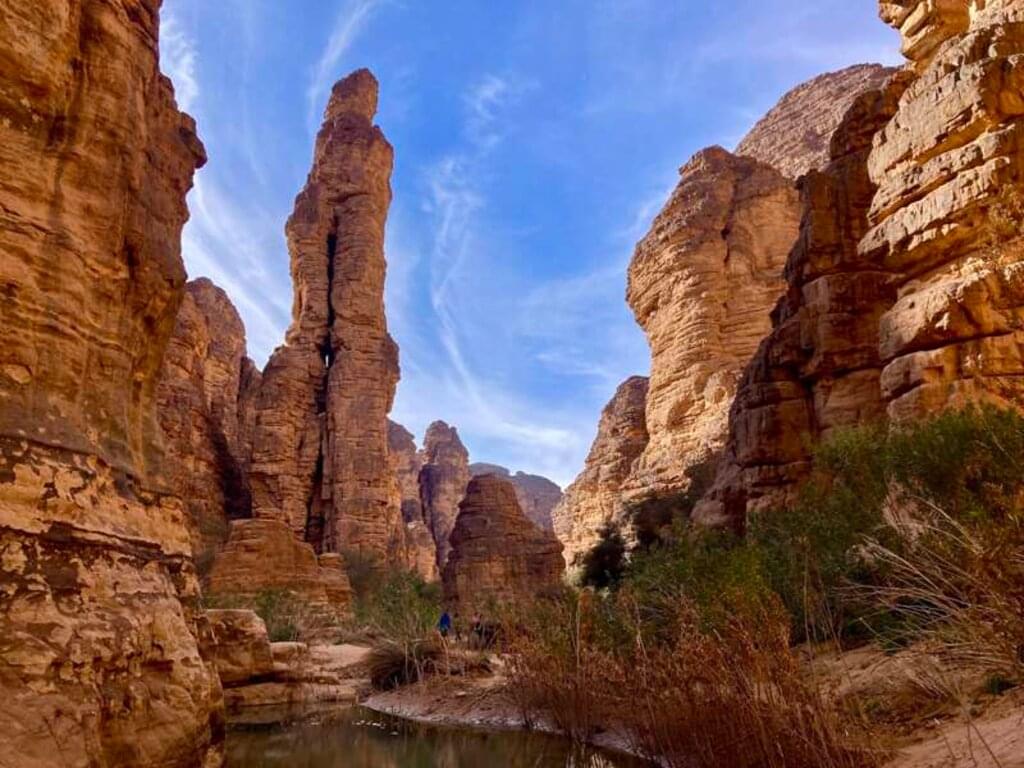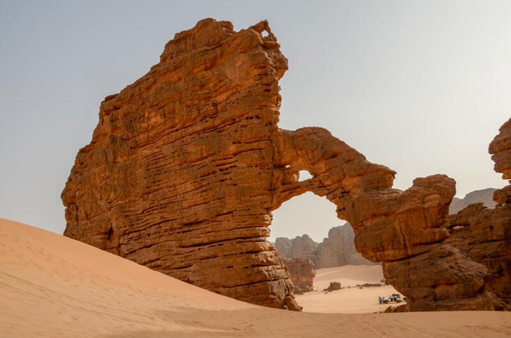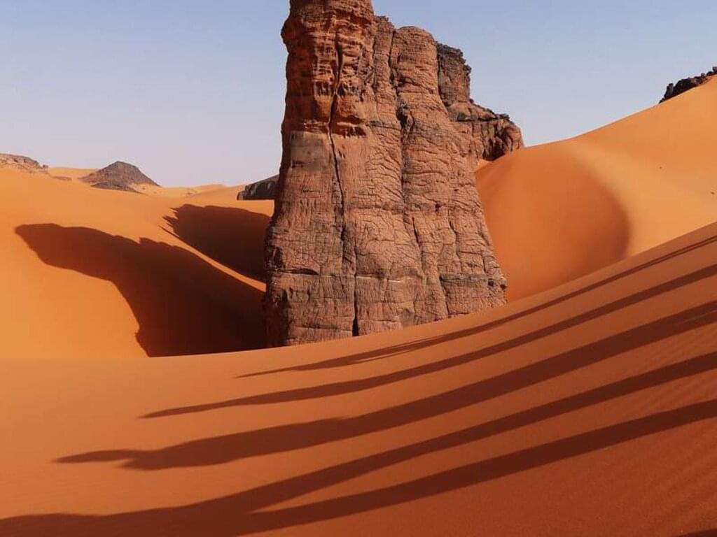 <Nach dem Frühstück fahren wir erneut zum Wadi Essendilène. Bei einer schattigen Wanderung finden wir mitten in der Sahara eine Welt für sich: üppiger Oleander und Tamarisken zwischen steil aufragenden Felswänden. Am Ende verzaubert eine Guelta, eine besondere Form einer natürlichen Wasserstelle, die je nach Lichteinfall flaschengrün leuchtet. Am Nachmittag fahren wir mit den Geländewägen zum Startpunkt unseres Trekkings – mit Halt an einer geheimnisvollen Ruhestätte. Woher kommt der Name Schlüssellochgrab? Wir wandern vom Felsbogen von Tikobaouine über die Plateaus und Schluchten des Tassili n'Ajjers und bewundern immer wieder die freistehenden Felsskulpturen am Wegesrand, bis wir in den Dünen unsere Zelte aufschlagen. -