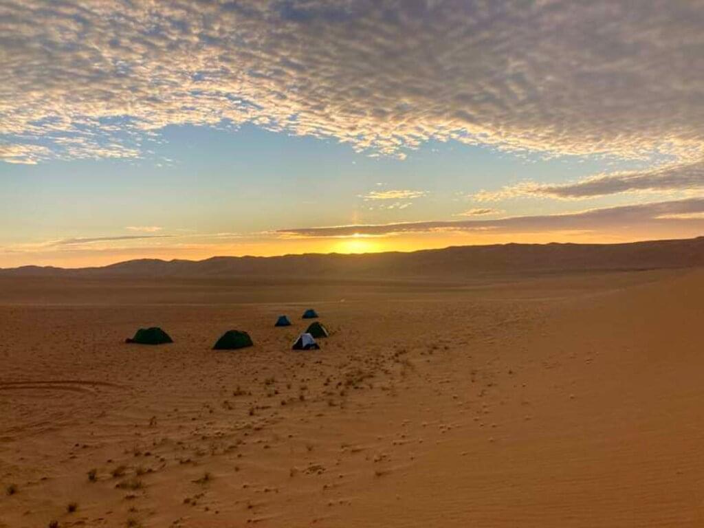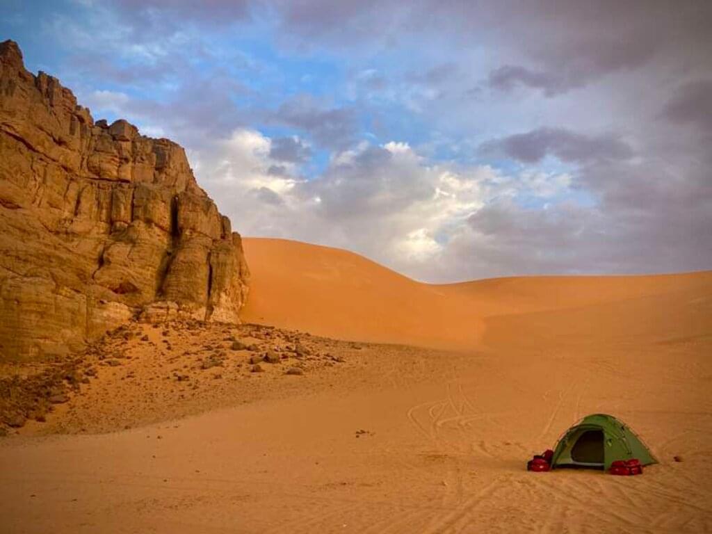 <Heute fahren wir in die Schlucht von Essendilène und wandern in einen Canyon zu einer grün-schimmernden Guelta, die eingebettet zwischen üppigem Oleander und ausladenden Tamarisken liegt. Wieder zurück zum Ausgangspunkt wartet unser Koch bereits mit dem Mittagessen auf uns. Nach einer ausgiebigen Pause fahren wir in Richtung Erg Essendilène mit Stop an den Gravuren von Tinterghert. Sie gehören zu den berühmtesten Felsgravuren der Sahara – besonders die "Schlafende Gazelle" und "Lockige Kuh" machen Eindruck! Wir bauen unsere Zelte inmitten der Sanddünen auf und genießen den Sonnenuntergang. -