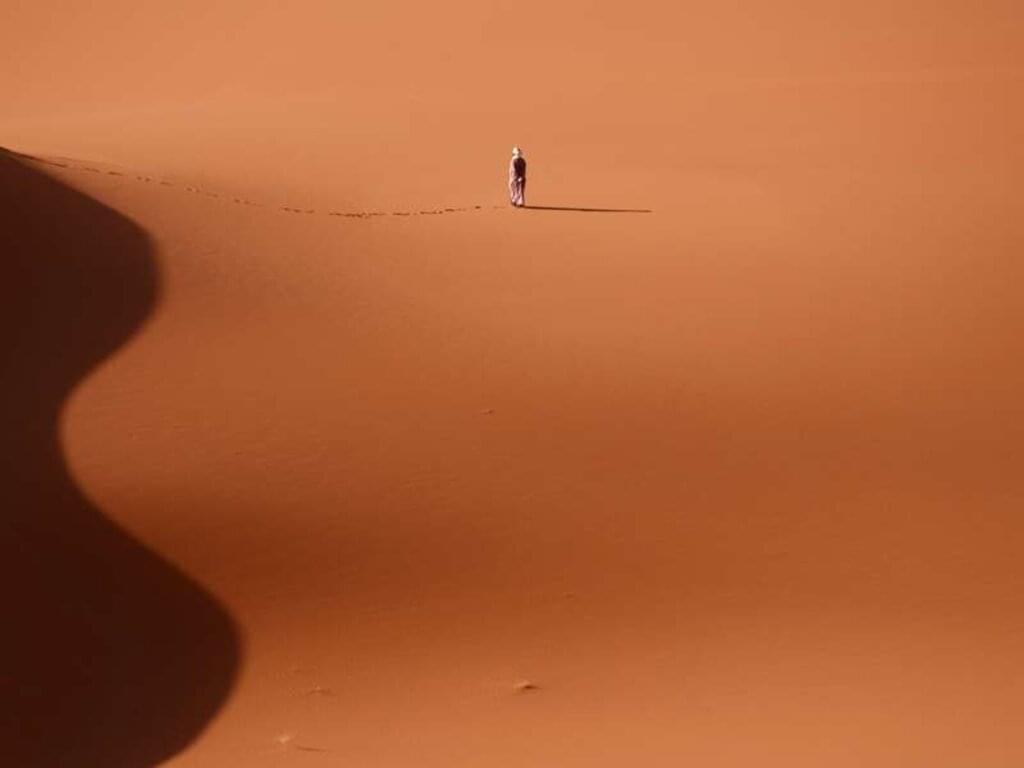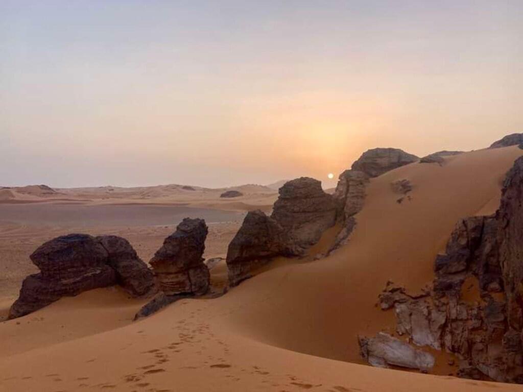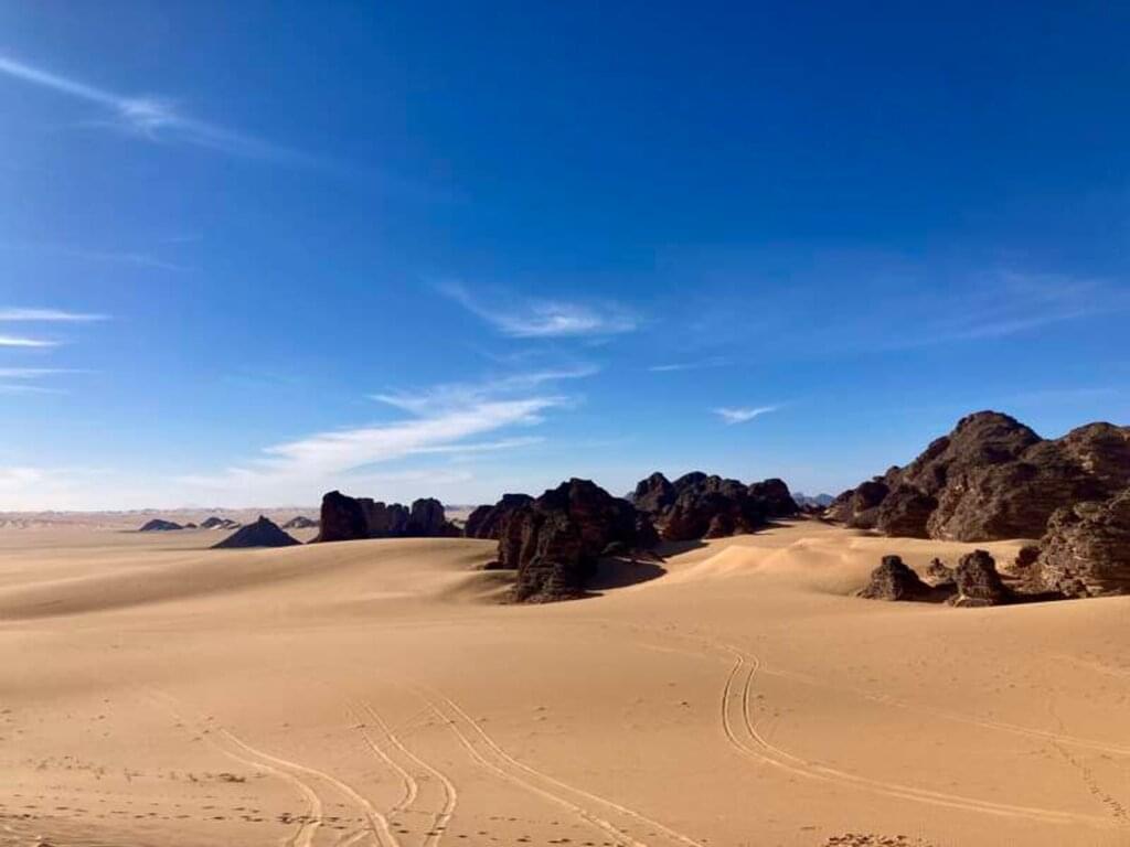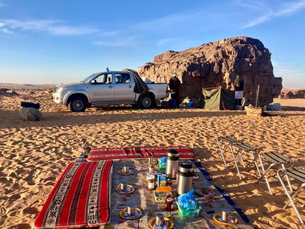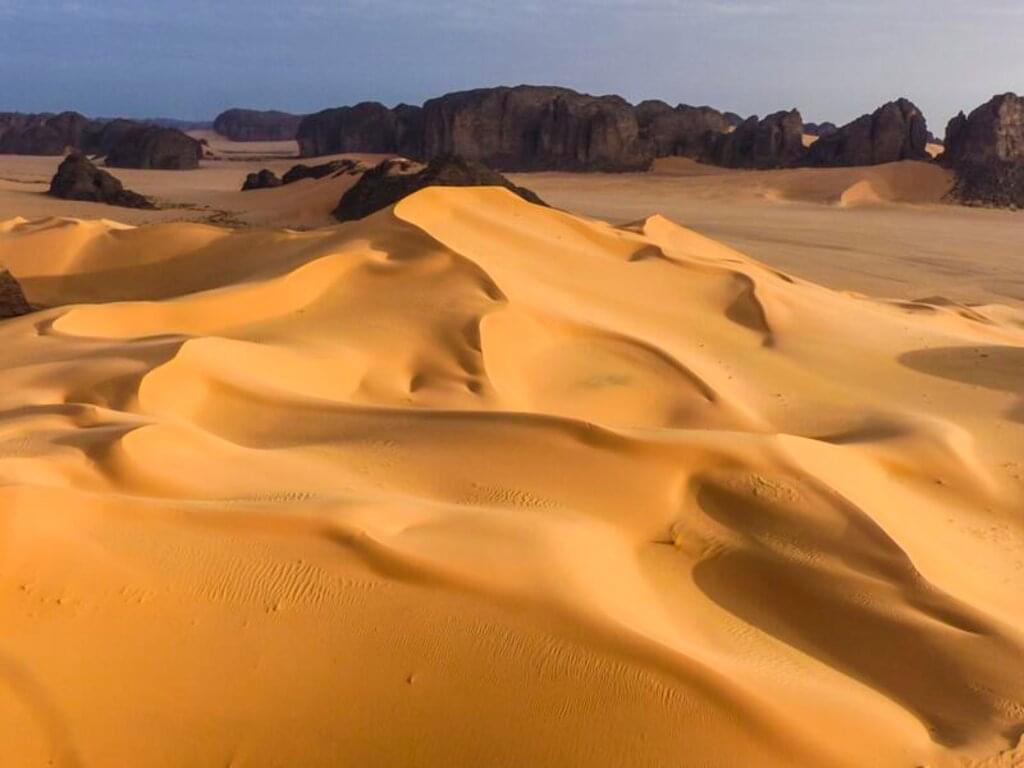 <Nach dem Frühstück fahren wir nach Djanet. Wir erledigen die nötigen Formalitäten bei der Nationalparkbehörde und haben etwas Zeit, über den kleinen Bazar zu schlendern. Wir verlassen die Stadt in Richtung Norden und fahren hinein in das Tassili n’Ajjer mit seinen endlos scheinenden Sanddünen. Mittags machen wir ein Picknick und erreichen am späten Nachmittag das Tuareg Dorf Iherir. Die folgenden zwei Nächte verbringen wir in einem Camp – entweder in Zeriba-Lehm-Hütten oder in unseren Zelten. Am Abend genießen wir in der Gemeinschaftshütte unser erstes gemeinsames Abendessen. -