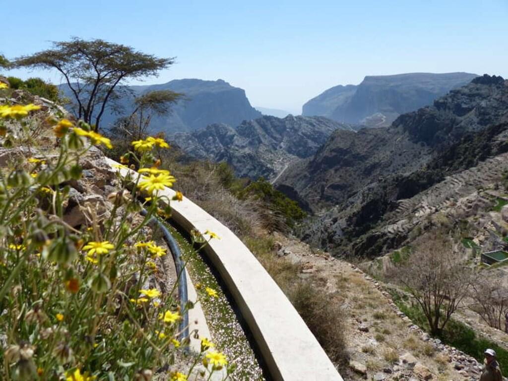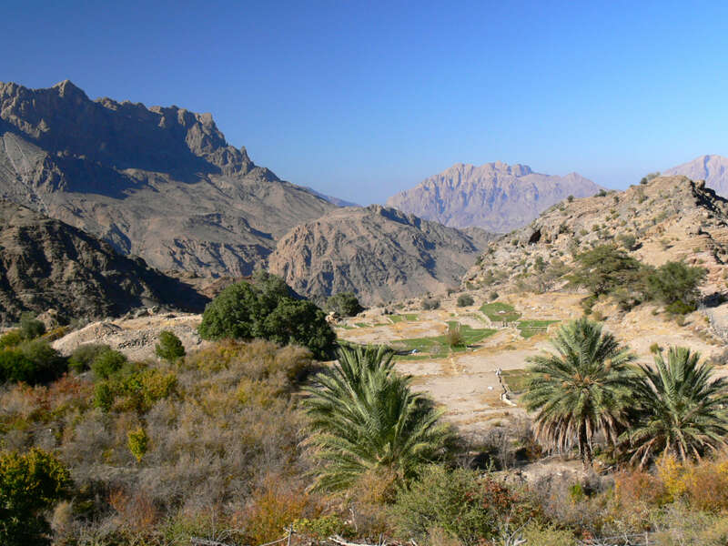 <Nach dem Frühstück führt uns unsere Fahrt in die Täler der majestätischen Berge. Durchfurchte Hänge und geheimnisvolle Höhlen, atemberaubende Steilwände, schroffe Felsüberhänge und tiefe Schluchten präsentieren sich in einem nicht beschreibbaren Farbenspiel. Mit einer unglaublichen Vielfalt an Naturwundern zieht sich das Gebirge über eine Länge von fast 500 Kilometern durch das Sultanat. Es schiebt eine bis zu 3.000 Meter hohe Barriere zwischen den Golf von Oman und die Wüstenlandschaften im Innern des Landes.Wir starten unsere Wanderung in Bimah, einer Siedlung, in der die Häuser überwiegend in traditioneller Steinbauweise erbaut sind. Von hier gelangen wir nach Selma und durch eine enge Schlucht, in der entlang der Felswände die Palmengärten aus Dattelpalmen, Mangobäumen und Bananenstauden angelegt sind, erreichen wir Balad Sit. -
