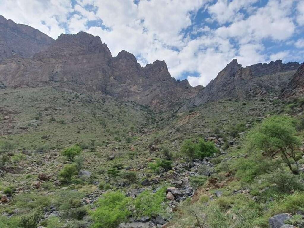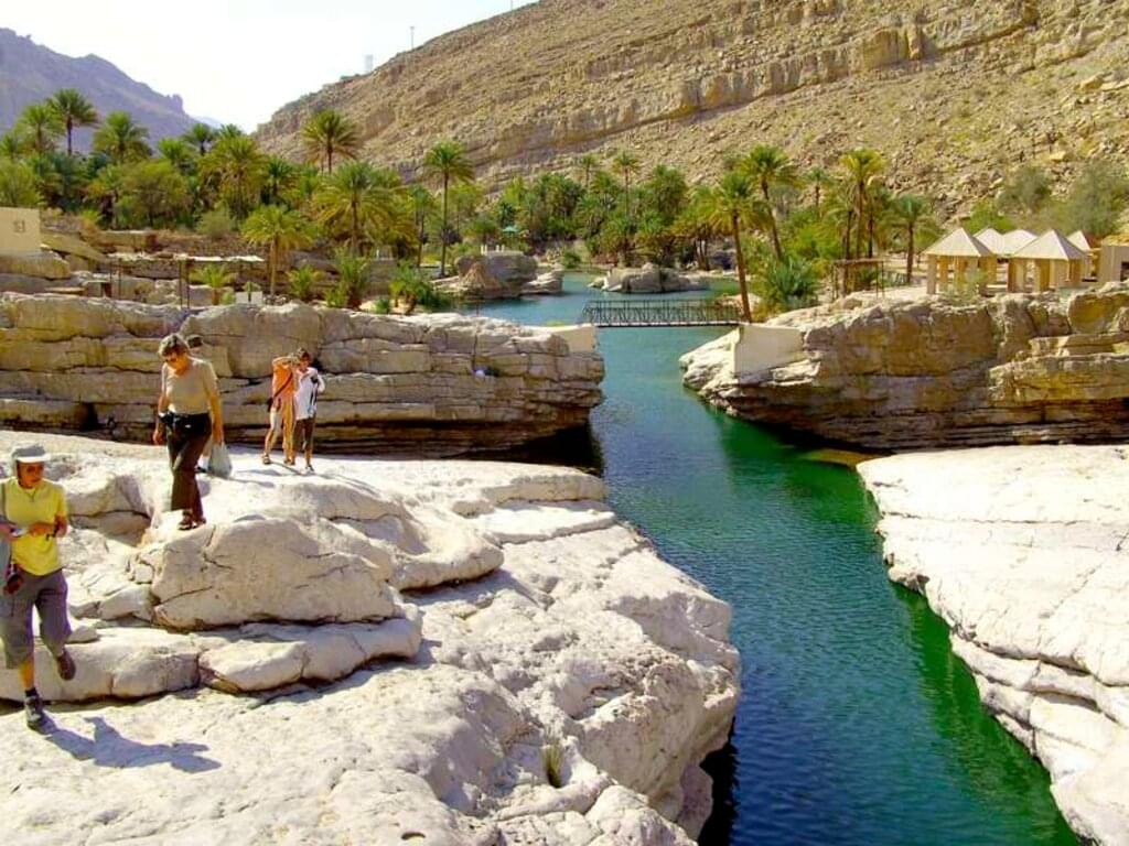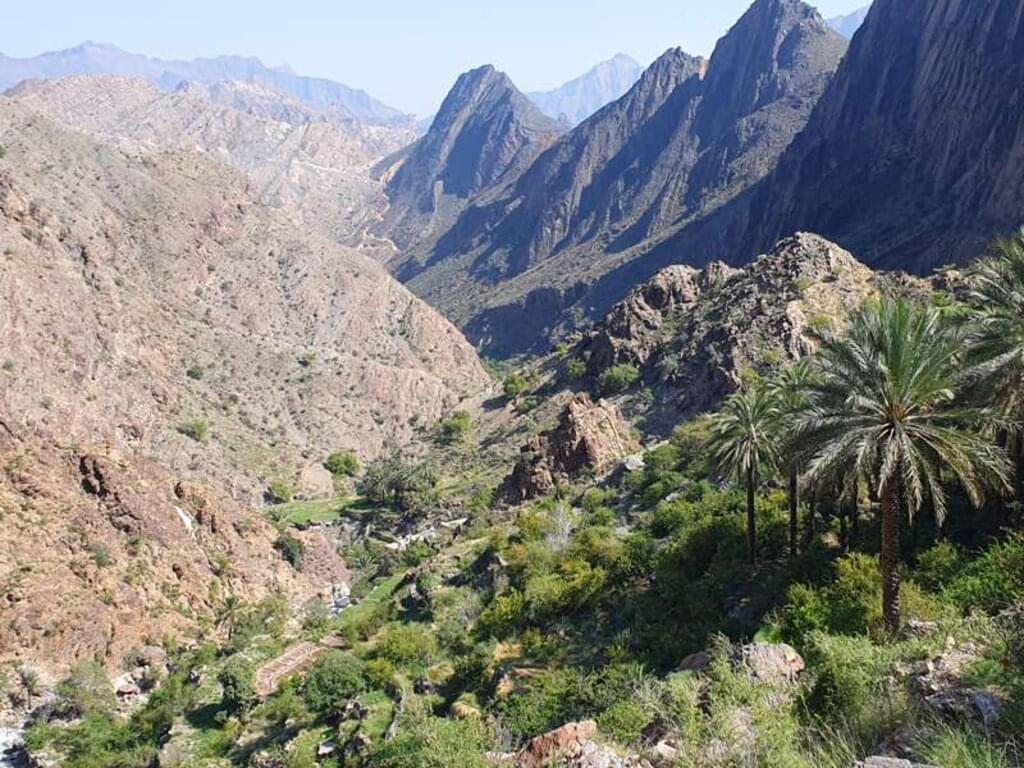 <Direkt von unserem Gästehaus aus wandern wir durch die Gassen der Oase Bimah, zwischen Steinhäusern hindurch tiefer hinein in das grüne Tal. Über kleine Pfade und jahrtausendealte Falaj-Bewässerungskanäle steigen wir auf zum typisch omanischen Bergdorf Salma, umgeben von vielen Gärten mit Dattelpalmen, Bananen und Mangos. Wir steigen auf Serpentinen hinab zum Dorf Balad Sit, einem der schönsten Dörfer des Hadschar-Gebirges. Nachdem wir eine kleine enge Schlucht durchwandert haben, holen uns die Fahrer ab und fahren uns auf einer interessanten Bergroute hinauf zum Jebel Shams. -