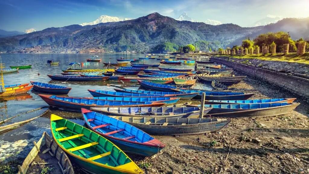 <Bevor wir Bandipur am späten Vormittag verlassen, starten wir auf eine kleine Wanderung nahe der Ortschaft und gehen auf die Jagd nach dem besten Aussichtspunkt. Anschließend bringt uns der Bus ins Tal von Pokhara (800 m). Die Stadt erstreckt sich über eine weite Fläche und ist in eine bezaubernde Berglandschaft eingebettet. Lohnenswert ist ein Bummel entlang der vielen Souvenir- und Trekkingläden zu den Gartencafés am Seeufer. Vom Ufer bietet sich bei klarem Wetter ein imposanter Blick auf die Achttausender-Massive Dhaulagiri und Annapurna mit dem "Fischschwanz" Machhapuchare. -