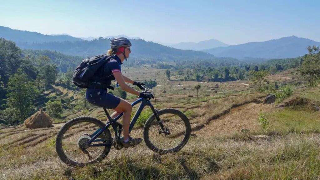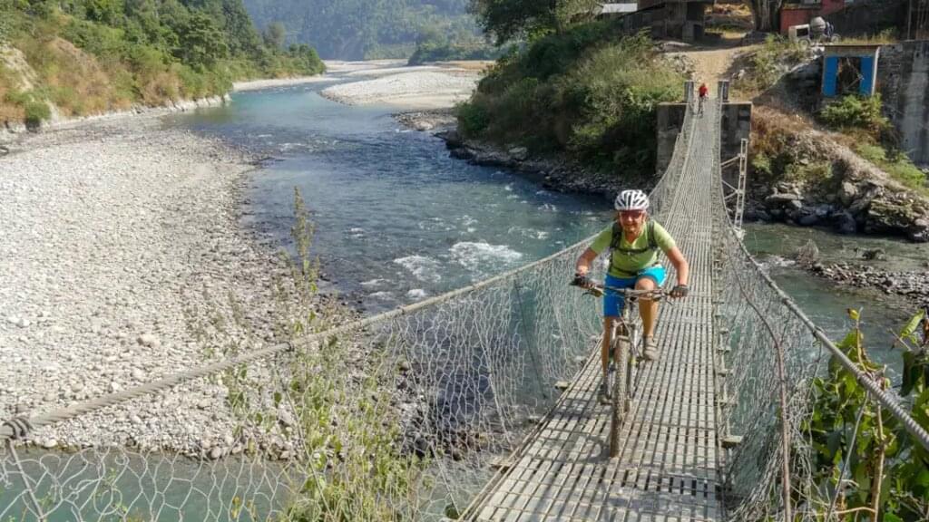 <Mit dem Bus gelangen wir über einen Pass zum Ausgangspunkt unserer Bikeroute nach Kakani. Unsere Himalaya-Panoramatour orientiert sich an einer alten Handelsroute. Den heutigen Tag prägen Eindrücke vom Nationalpark, ein langer Downhill und überwiegend Fahrten zwischen Flusslandschaften mit Überquerung einer abenteuerlichen, befahrbaren Brücke und Terrassenfeldern sowie Begegnungen mit den Einheimischen. Wir radeln über Thansing Phat nach Sera in Trisuli. -