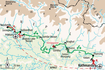 MTB Reise von Kathmandu über Königsstädte und Tempel nach PokharaDie eisbedeckten Bergriesen - die höchsten Gipfel der Welt - die Tempel, Königspaläste und nicht zuletzt die gastfreundlichen Menschen sind es, die Nepal so anziehend machen. Um die prachtvollen Gebirgslandschaften des kleinen Landes im Himalaya nicht nur Wanderern, sondern auch Bikern zu erschließen, bieten wir in Nepal eine Mountainbiketour an. Diese orientiert sich an einer alten, längst in Vergessenheit geratenen Handelsroute. Die Bike-Tour führt im Herzen des Himalaya über die alte Handelsroute von Kathmandu nach Pokhara an den Phewa-See. Seit die Überlandstraße gebaut wurde, werden die Bergpfade nur noch von Dorfbewohnern benutzt. Kennen lernen und genießen werden Sie die volle Bandbreite an Wegen. Sie biken zu 90 Prozent auf Karrenwegen, Sand-, Lehm- und Schotterpisten sowie auf vielen herrlichen Höhen-Trails. Von den Pässen und Bergkämmen, die auf der Route überwunden werden, bieten sich atemberaubende Ausblicke auf die Gipfel des Manaslu, des Lamjung-, Annapurna- und Langtang-Massivs bis zum Mount Everest. Unterwegs haben Sie immer wieder die Möglichkeit, in den Dörfern Kontakte zu knüpfen. Nicht selten werden Sie neugierige Blicke aus lachenden Kinderaugen erfreuen. Ein ortskundiger lokaler Mountainbike-Guide ist bei der Gruppe und vermittelt zwischen Bikern und Dorfbewohnern, so dass echte Begegnungen möglich sind. Großes Bike-Erlebnis mit tollem Himalaya-Panorama!Reisebericht