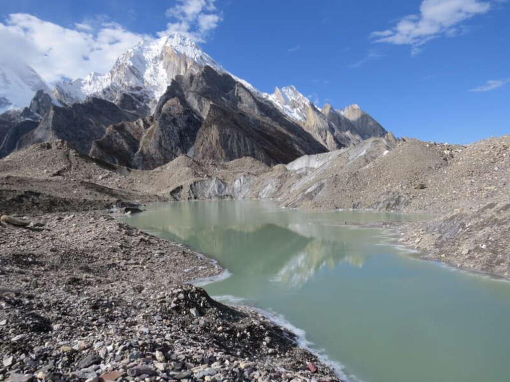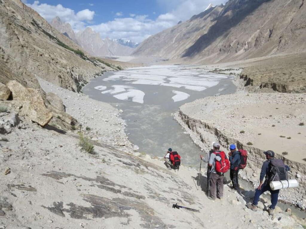 <Zusammen mit unseren Trägern wandern wir nach Korophon (3.100 m) an der Endmoräne des Biafo-Gletschers. Hier essen wir an einem schönen Sandplatz zwischen den Weiden am Bachufer zu Mittag. Der Biafo-Gletscher gilt als drittgrößter Gletscher im Karakorum. Von Korophon geht es dann noch 2 Std. weiter. Kurz vor Erreichen des Camp Jola überqueren wir den Fluss Dumordo mittels einer Hängebrücke. Ab dem Biafo-Gletscher ist die Baltoro-Region "Sperrgebiet". Während der folgenden Tage zelten wir in den traditionellen Camps der Expeditionen, die alljährlich in den Karakorum "pilgern". -