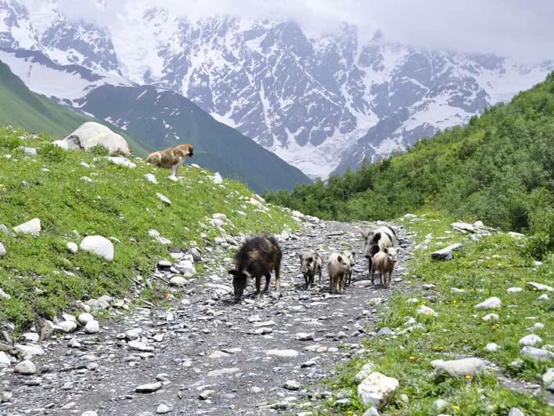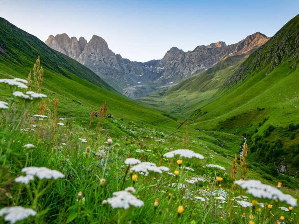<Von Stepanzminda fahren wir ca. 45 Minuten durch Bergdörfer zum Dorf Djuta (2.150 m). Unsere Wanderung führt entlang eines Flusses – wir werden auf jeden Fall über die Vielfalt der endemischen Flora staunen. Schon vom Dorf aus erblicken wir das Bergmassiv Chaukhi (3.680 m), dem wir uns allmählich nähern. Wieder müssen wir Bäche überqueren, bevor wir am Fuß des Berges stehen – ein Eldorado für Kletterer und Alpinisten. Auf dem Weg zurück nach Tiflis essen wir bei einer lokalen Familie im Dorf Aranisi nahe der Festung Ananuri zu Abend. -