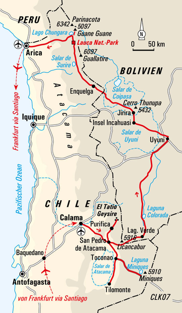 Wanderreise durch die Atacama-Wüste und auf dem größten Salzsee der WeltDie Nacht ist klar, die Milchstraße funkelt am Himmel über der trockenen Wüste. Eine Sternschnuppe huscht über den Horizont. Wir lehnen uns zurück und genießen die magische Stimmung der Atacama. Im rotfärbenden Licht der aufgehenden Sonne sprudeln und dampfen die Fontänen der Tatio-Geysire in die Höhe. Gestärkt durch ein wohltuendes Frühstück streifen wir durch die Cordillera de Sal mit ihren teils mit Salzkristallen bedeckten, bizarren Gesteinsformationen. In den wärmenden Thermalquellen von Puritama entspannen wir uns nach unserem Wandertag. Zottelige Alpakas und rosarote Flamingos beobachten uns dabei heimlich. Vorbei am imposanten Vulkan Licancabur und an tiefrot leuchtenden, matt grün schillernden und strahlend blauen Hochlandlagunen überqueren wir das bolivianische Altiplano. Dort wartet das nächste Highlight auf uns: der Salar de Uyuni, der größte Salzsee der Welt. Mit unseren Jeeps fahren wir über die strahlend weiße Salzpfanne bis wir am Horizont die Insel Incahuasi mit ihren riesigen Kakteen entdecken. Vom kegelförmigen Vulkan Thunupa blicken wir im Süden über die Weite des Salzsees und im Norden auf die farbenprächtige Kraterwand des Vulkans. Wieder in Chile glänzt der Salar de Surire pastelblau im Sonnenlicht. Wir bauen unser Camp am salzverkrusteten Ufer des Sees auf. Das Spiegelbild des Bilderbuchvulkans Parinacota im Lago Chungara lässt unser Herz höher schlagen. Die Sonne geht unter und die Sterne nehmen erneut das Dach der fast menschenleeren Wüste ein.