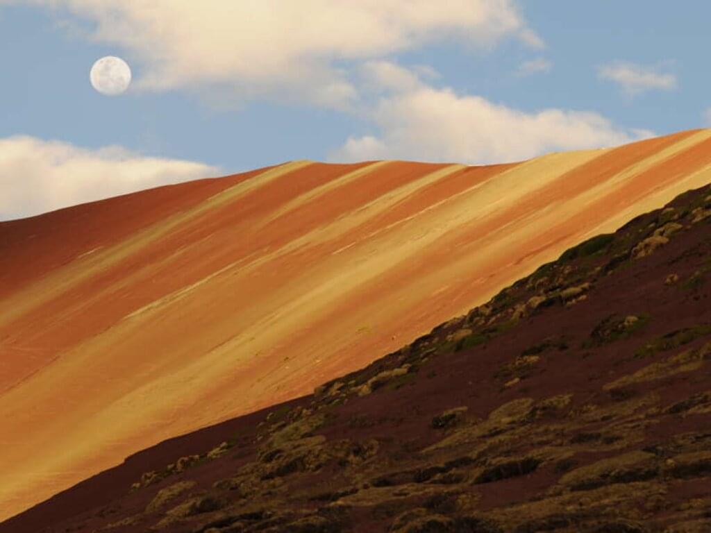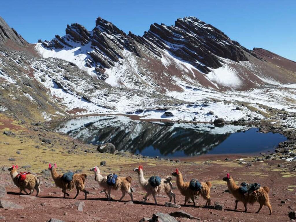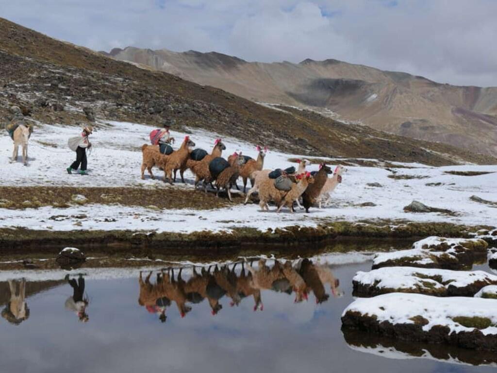 Trekkingreise von Cusco bis in die Cordillera VilcanotaBunt gestreifte Sedimenthügel, schneebedeckte Anden-Gipfel, die sich im türkisfarbenen Wasser der Gletscherseen spiegeln, geheimnisvolle Inkastätten inmitten der Bergwelt. Lama- und Alpakahirten begleiten uns auf dem mehrtägigen Trekking auf versteckten Inkapfaden durch das Gebirge der Cordillera Vilcanota – den 6.384 m hohen Apu Ausangate haben wir immer im Blick. Bei klarem Wetter ist er sogar von der Inkahauptstadt Cusco aus zu sehen. Sein Gipfel gilt für die Andenvölker als "Apu", als heilige Berggottheit, als Beschützer der Bewohner und ihrer Tiere. Unsere "Andenkamele" sind unsere treuen Weggefährten und übernehmen den Gepäcktransport. Die ersten Sonnenstrahlen begrüßen uns und lassen den Vinicunca in seiner Farbenpracht noch intensiver leuchten. Der Vinicunca wird daher gerne "Rainbow Mountain" – der Regenbogenberg – genannt. Dieser spektakuläre Fotospot ist aber nur einer der vielen Highlights auf dem Apu Ausangate Lodge-Trekking. Wir überqueren zu Fuß Pässe mit über 4.500 m und genießen atemberaubende Weitblicke über die Anden. Während des Trekkings sind die Lodges der Organisation "Camino del Apu" unser komfortables Zuhause. Dabei tragen wir dazu bei Arbeits- und Ausbildungsplätze zu sichern und Landflucht zu verhindern, denn die Betreiber der Unterkünfte sind die Dorfbewohner selbst. Freuen Sie sich auf ein Trekking mit einem richtigen Dach über dem Kopf, einer heißen Dusche im Zimmer, bester Verpflegung durch lokale Köche und intensiven Begegnungen mit Hirten und Dorfbewohnern in wunderschöner Natur!