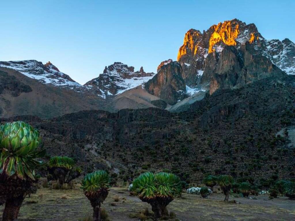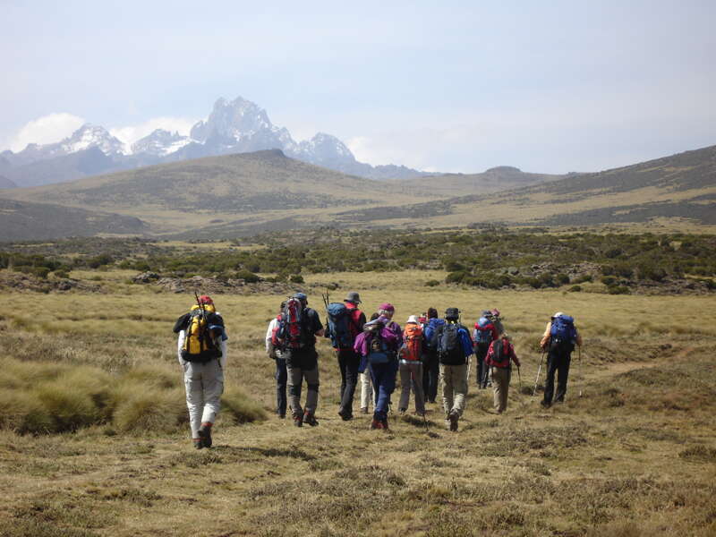 <In gemächlichem Tempo wandern wir nach dem Frühstück leicht ansteigend weiter. Wir kommen an Senezien und Lobelien vorbei, die so typisch für diese Vegetationszone und die Bergwelt Ostafrikas sind. Vor der Kulisse des schroffen Gipfelaufbaus sind sie ein einmaliges Fotomotiv. Am Allan's Point legen wir unsere Mittagsrast mit unseren Lunchpaketen ein, bevor wir nach der Nachmittagsetappe schließlich das Major's-Wildniscamp erreichen. -