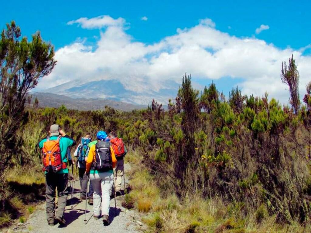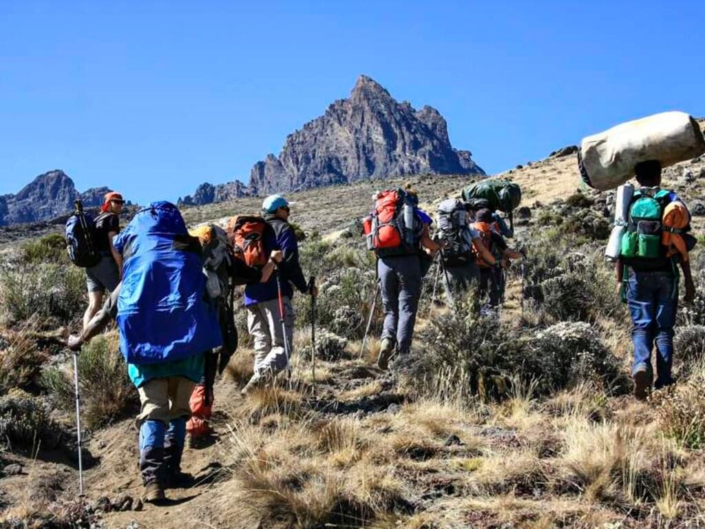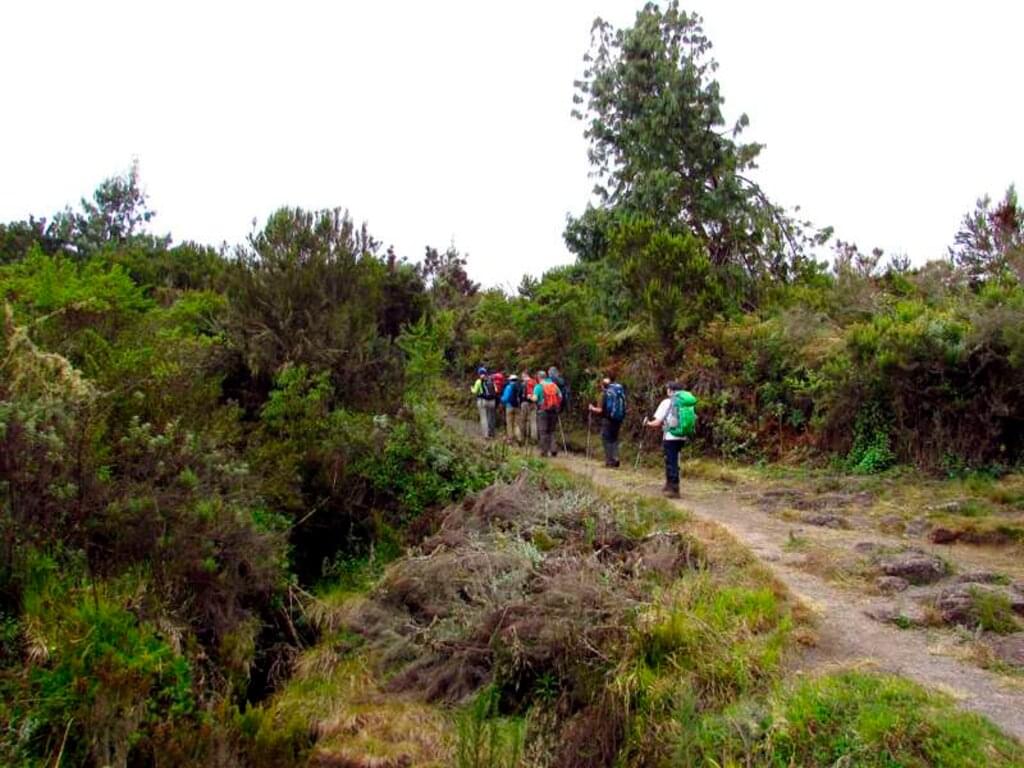 <Nach dem Frühstück fahren wir auf guter Straße um den Berg herum nach Nalemoru nahe der kenianischen Grenze, dem Ausgangspunkt der Bergbesteigung. Hier erwartet uns bereits unsere Begleitmannschaft, die aus mehreren Trägern, einem Koch, einem Assistant Guide und einem Guide besteht. Die Größe der Mannschaft ist abhängig von der Gruppengröße. Wir registrieren uns im Bergbuch und dann wandern wir los. Der erste Teil der Strecke führt an Feldern vorbei, an die sich auf dieser Seite des Berges der sehr schmale Regenwaldgürtel anschließt. Wir gehen sanft bergauf. Ohne große Anstrengung erreichen wir die Baumgrenze und das Simba Camp (2.625 m). Meist stehen die Zelte schon und die Mannschaft erwartet uns mit einem heißen Tee. Wer möchte, kann nachmittags noch ein Stückchen weiter bergauf gehen - bitte mit dem Guide absprechen. -
