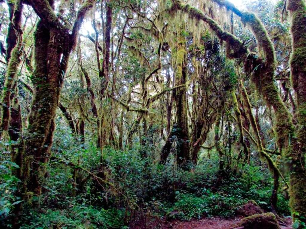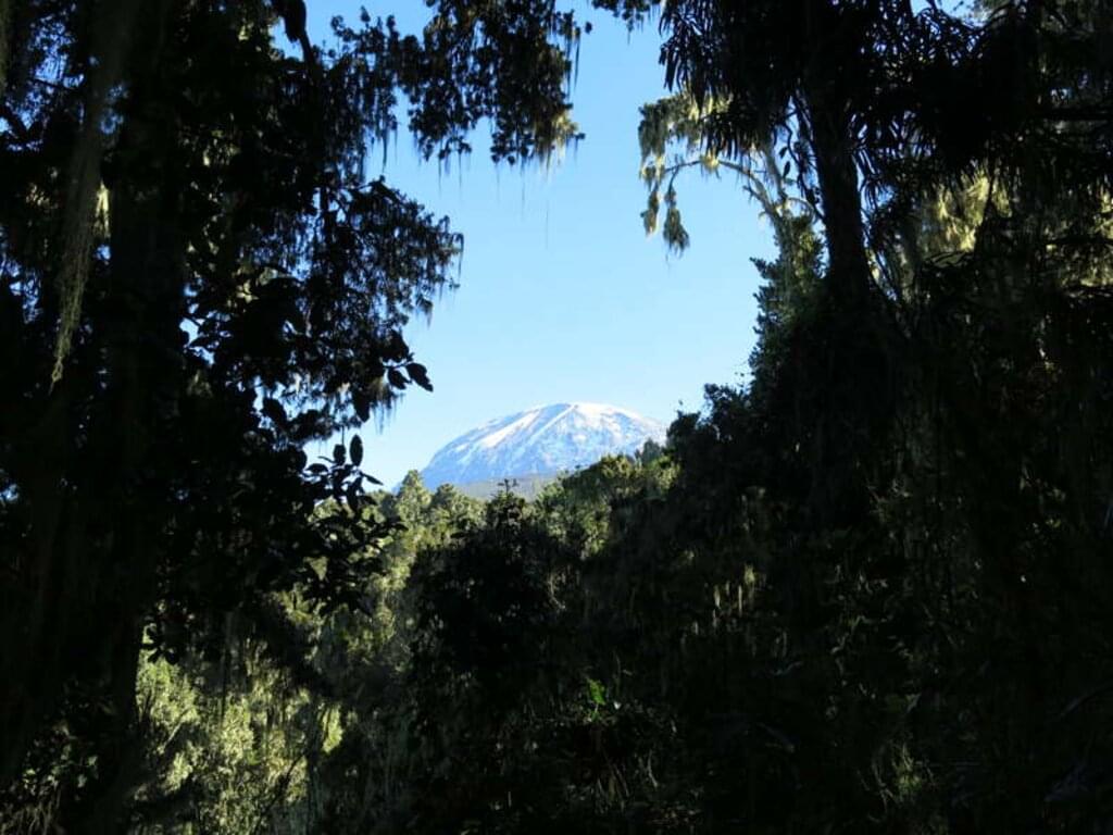 <Früh fahren wir nach Machame, dem Ausgangspunkt für die Kilimanjaro-Besteigung. Nach der Meldung am Gate (1.790 m) steigen wir mäßig auf einem breiten Waldweg an, der bald in einen Pfad übergeht. Durch feuchten Regenwald geht es weiter. Zum Teil sind große Stufen und steile Passagen zu überwinden. Der Weg führt ständig über Wurzelwerk, durch üppigen Regenwald mit Kilimanjaro-Springkraut, Farn und vielen anderen Pflanzen. Je nach Wegbeschaffenheit, kann es sein, dass unsere Füße auch mal im Schlamm einsinken, Gamaschen sind hier gegebenenfalls hilfreich. Wir erreichen das Machame Camp (2.835 m), wo der Regenwald in die Hochmoorlandschaften übergeht. -