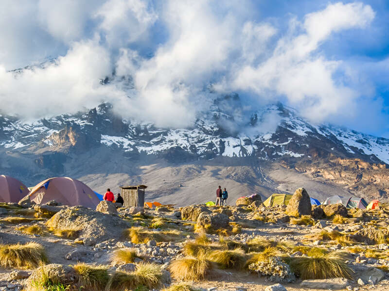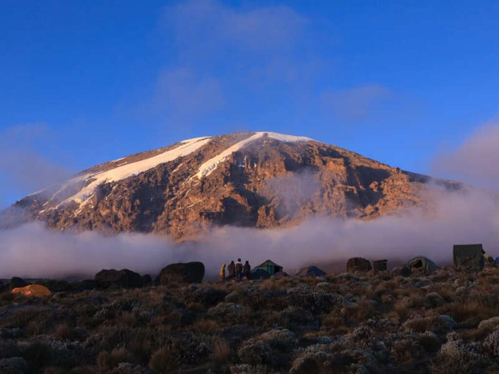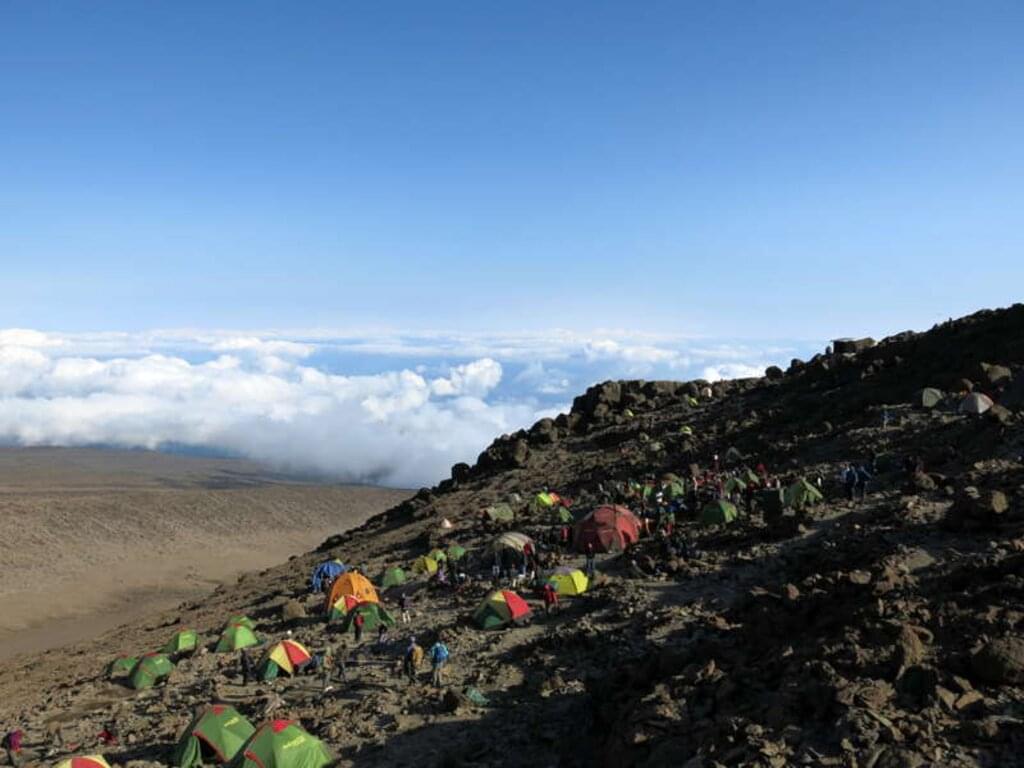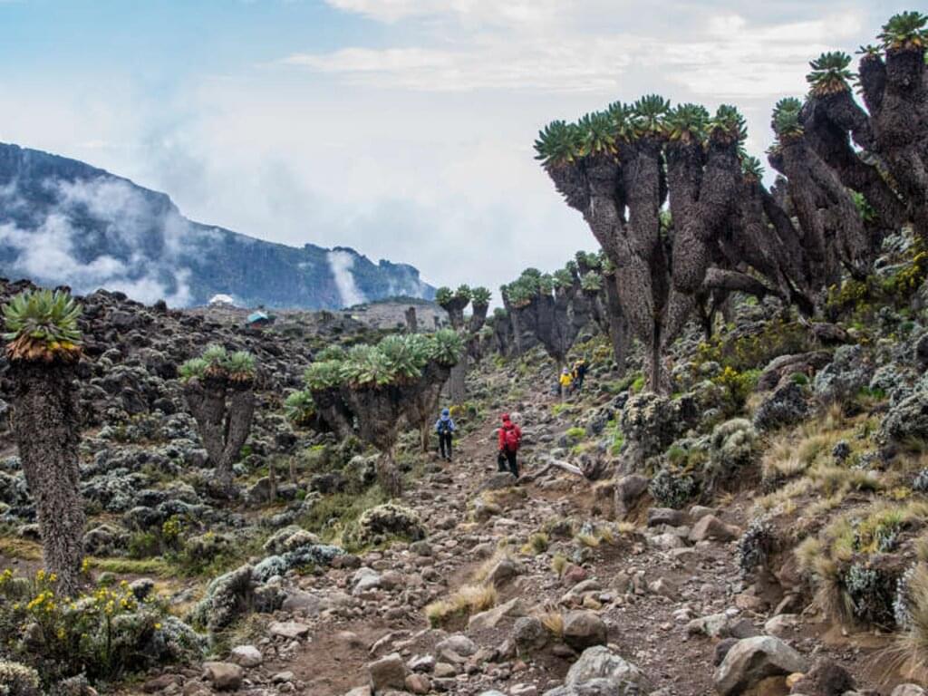 <Der heutige Tag ist aufgrund der zu überwindenden Höhenmeter anstrengend, aber der Akklimatisierung sehr zuträglich, da sich die Schlafhöhe nur um 115 Höhenmeter erhöht, wir aber etwa 850 Höhenmeter bis zum Lava Tower aufsteigen. Zunächst führt der Pfad gleichmäßig ansteigend in die alpine Wüste, bis wir auf 4.600 m zum Mittagessen den Lava Tower erreichen. Den mächtigen Kibo haben wir zum Greifen nahe bis zum Lava Tower immer im Blick. Wir gehen in südlicher Richtung auf dem Southern Circuit wieder bergab zum Barranco Camp (3.900 m), wo unsere Zelte bereits aufgestellt sind. Umgeben von Senecien genießen wir die Aussicht auf Western Breach, Heim- und Deckengletscher. -