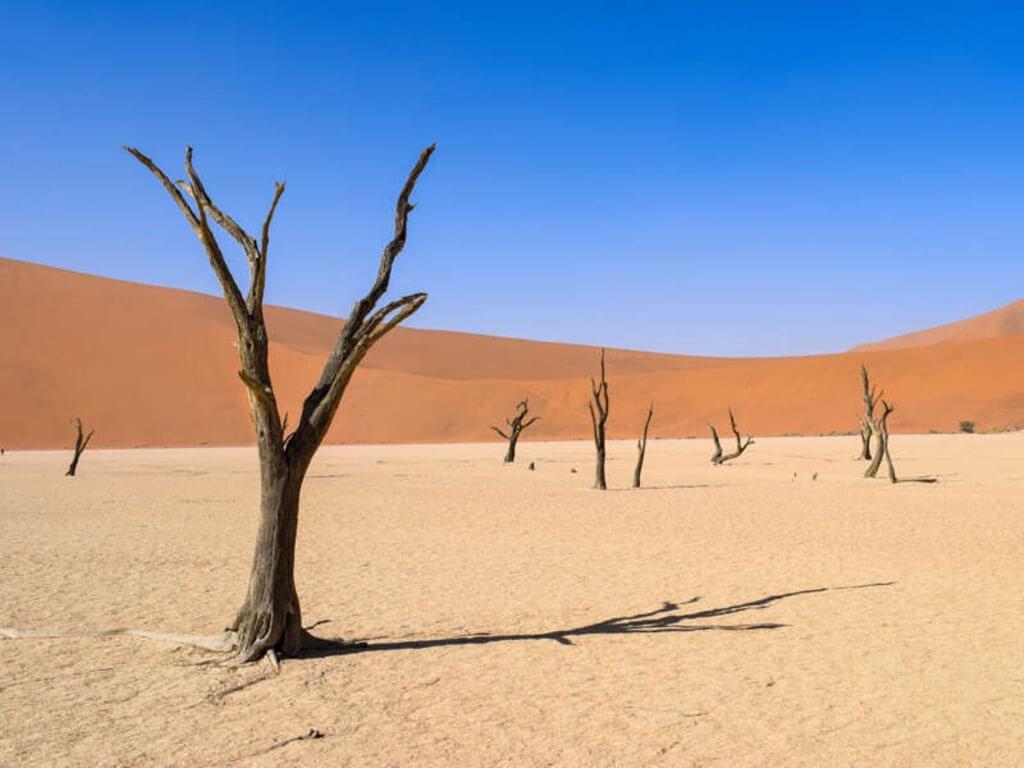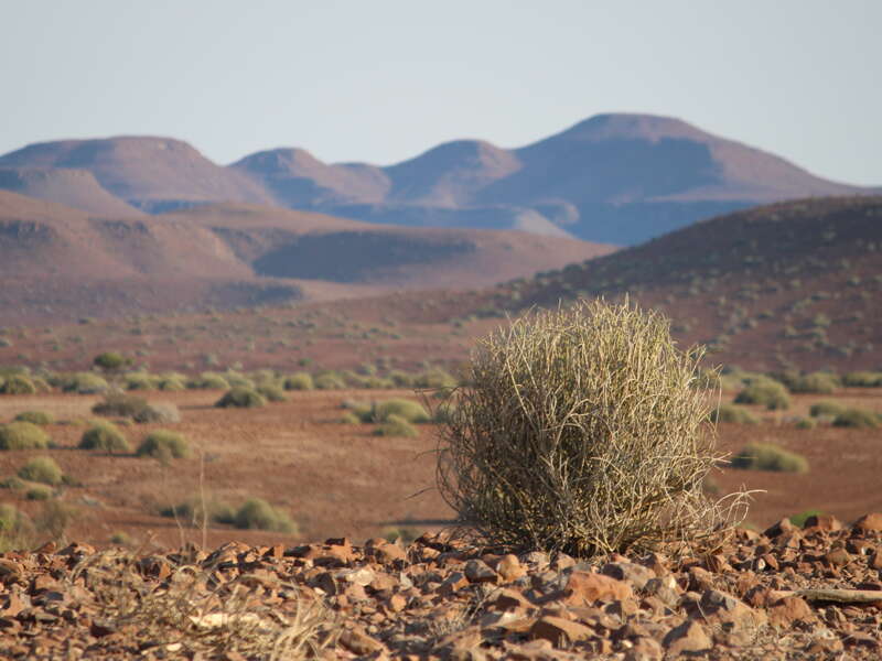 <Am Morgen wandern wir durch den roten Sand der Kalahari. Sie erstreckt sich vom Südosten Angolas über den Osten Namibias und den Westen Botswanas bis in den Norden Südafrikas. Damit ist sie die größte zusammenhängende Sandfläche der Welt und für heute Vormittag unser Wandergebiet. In den knorrigen Kameldornbäume hängen die Bauten der geselligen Webervögel und Strauße sind meist auch unterwegs. Gegen Mittag fahren wir über Mariental zum Köcherbaumwald. Köcherbäume sind im ganzen Land zu finden, aber nirgends in so einer großen Anzahl wie hier. Beim Sonnenuntergang bieten die Köcherbäume hervorragende Fotomotive. -
