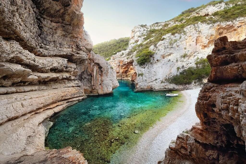 <Ein morgendlicher Bootsausflug bringt dich auf die Nachbarinsel Vis. Im Herzen der Adria und vor der dalmatinischen Küste gelegen, ist Vis bekannt für seine alten Stadtmauern und seine Thermen (öffentliche Bäder). Während du die Insel umrundest, kannst du in der Green Cave schwimmen gehen. Danach kannst du in der Blauen Höhle schnorcheln, bevor du zum Stiniva Beach weiterfährst - einer abgelegenen Bucht mit dramatischen Klippen und einem engen Eingang. Heute Nachmittag kehrst du nach Vis zurück. Heute Abend kannst du dich an den herrlichen Stränden entspannen oder durch die Bars und Restaurants der Insel schlendern - Lust auf einen Aperitif bei Sonnenuntergang?