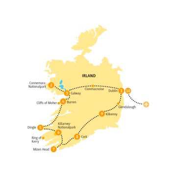 <Am Morgen überquerst du die Mündung des Flusses Shannon und beginnst die Erkundung der malerischen Dingle-Halbinsel. Die nördlichste der fünf Landzungen im Westen des Landes ist mit ihrer unberührten Natur und der außergewöhnlich hohen Dichte an frühchristlichen Hinterlassenschaften eine ganz besondere Region. Du reist bis in das kleine lebhafte Fischerstädtchen Dingle, wo du Gelegenheit hast, durch die gemütlichen Gassen zu schlendern. Am Nachmittag besuchst du eine Schaffarm, auf der du interessante Einblicke in das Leben von Schafbauern erhalten wirst. Hier kannst du beobachten, wie der Farmer seine Hütehunde antreibt, um die Schafe einzukreisen und zu kontrollieren. Am Inch Beach, der durch den Film »Ryan’s Daughter« bekannt ist, kannst du dir zum Abschluss des Tages noch etwas die Beine vertreten und die Iveragh Halbinsel und Rossbeigh Beach bewundern. Am Abend erreichst du deine Unterkunft in der Region Kerry.