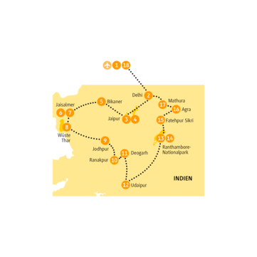 Eine blaue Stadt, eine rosa Stadt, eine goldene Stadt. Zur Abwechslung das Rote Fort der Maharadschas und sehr viel Weiß im Venedig des Ostens. Dazu die silberne Nacht im Wüstencamp der mondscheinhellen Thar und das schönste Bauwerk der Menschheit, nach dem diese Reise benannt ist: das Taj Mahal, Zeugnis einer unvergänglichen Liebe. Die mit Edelsteinen besetzte Vergangenheit ist dir sicher. Nur die Tiger im Ranthambore-Nationalpark wollen und wollen mal nicht.