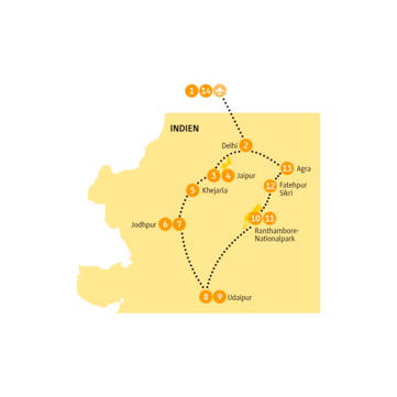 - 2 Safaris im offenen Safariwagen im Ranthambore-Nationalpark, Geländewagenfahrt durch die Wüste Thar, Bootsfahrt auf dem Pichhola-See in Udaipur, Tuk-Tuk-Fahrt und Yogastunde in Jodhpur