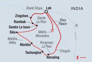 Verlasse die Touristenpfade für ein unglaubliches Trekking-Erlebnis in Ladakh - von Delhi nach Leh gehst du auf den Markha-Tal-Trek und wanderst durch fast unberührtes Land. Halte Ausschau nach Wildtieren wie Adlern, Ziegen und den seltenen blauen Schafen und verbringe die meisten Tage in der Wildnis dieses wilden Landes, das vom Himalaya umgeben ist. Zelte fast jede Nacht unter einem Nachthimmel ohne Lichtverschmutzung und triff herzliche Einheimische, die dir einen einzigartigen Einblick in ihr tägliches Leben geben. Besuche geheimnisvolle alte Ruinen, wandere durch buddhistische Klöster mit unglaublichen Aussichten und genieße eine der köstlichsten authentischen Küchen Indiens - das ist genau das, was du dir von einer Trekkingtour erhofft hast!