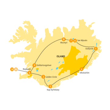 <Die Aufregung steigt, denn nun lernst du deine Gruppe und die Reiseleitung kennen, die dich quer durch Island mit all seinen Farben und Facetten begleiten. Nach einer Stärkung geht es auch schon los, um die am dünnsten besiedelte Insel Europas zu erkunden. Du wirst erstaunt sein, wie vielfältig die Landschaft hier durch Naturkontraste wie Vulkane, heiße Quellen, Geysire und grüne Wiesen geprägt ist. Mit dem Staunen geht es direkt los und es wird in den kommenden Tagen auch nicht aufhören. Versprochen! Du fährst heute zum einzigen UNESCO-Weltkulturerbe des Landes, den Thingvellir-Nationalpark. Hier kam zu Zeiten der Wikinger das erste isländische Parlament Althing inmitten einer imposanten Felskulisse zusammen. Die beschlossenen Gesetze wurden anschließend auf dem Lögberg verlesen. Doch auch die Natur hat hier einiges zu bieten. Kommt dir die Landschaft bekannt vor? Wenn ja, dann hast du bestimmt Game of Thrones oder einen der vielen anderen Filme, die hier gedreht wurden, gesehen. Halte deine Kamera bereit für die beeindruckende Allmännerschlucht. Hier siehst du die Auswirkung des Auseinanderdriftens der Nordamerikanischen und der Eurasischen Felsplatten. Anschließend fährst du weiter auf dem sogenannten »Golden Circle« zum zuverlässig ausbrechenden Geysir Strokkur und zum eindrucksvollen Wasserfall Gullfoss. Anschließend besuchst du eine Milchfarm, die von vier Geschwistern bereits in siebter Generation betrieben wird. Hier wirst du mit traditionellen Spezialitäten aus hofeigenen Produkten verwöhnt. Verpasse bloß nicht den frischen Skyr und die himmlische Eiscreme.