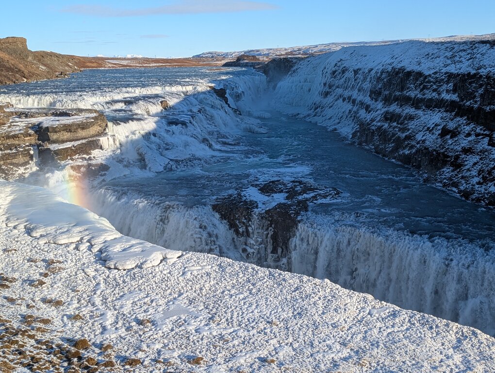 <Am Morgen starten wir zu den bekanntesten Sehenswürdigkeiten Islands. Wir erkunden das Gebiet der Geysire mit der aktiven Springquelle Strokkur, den beeindruckenden Wasserfall Gullfoss und bewundern die Naturschönheiten des sogenannten Goldenen Kreises im Winterlicht. Wir wandern und legen heute unterwegs möglichst viele Stopps ein.