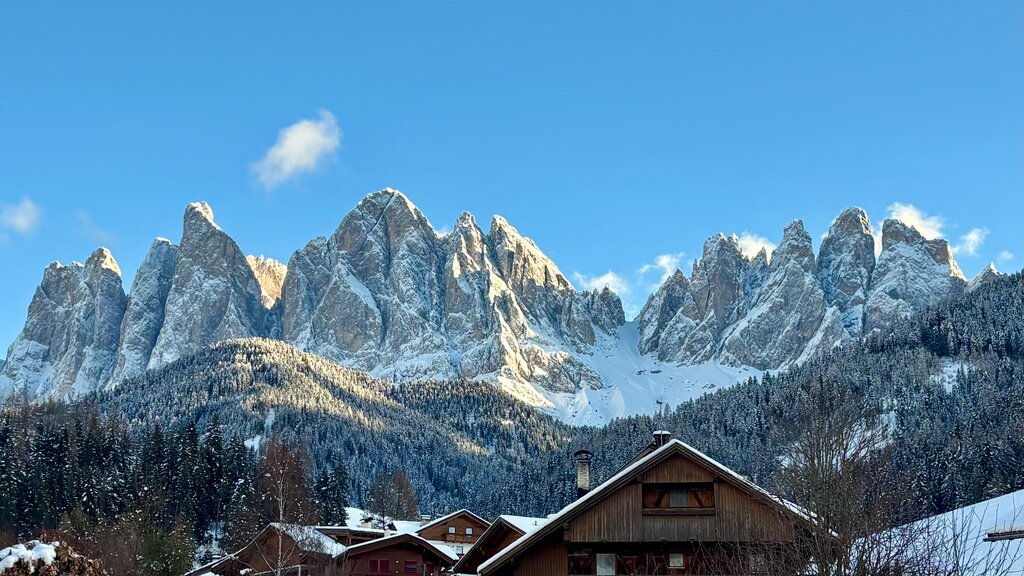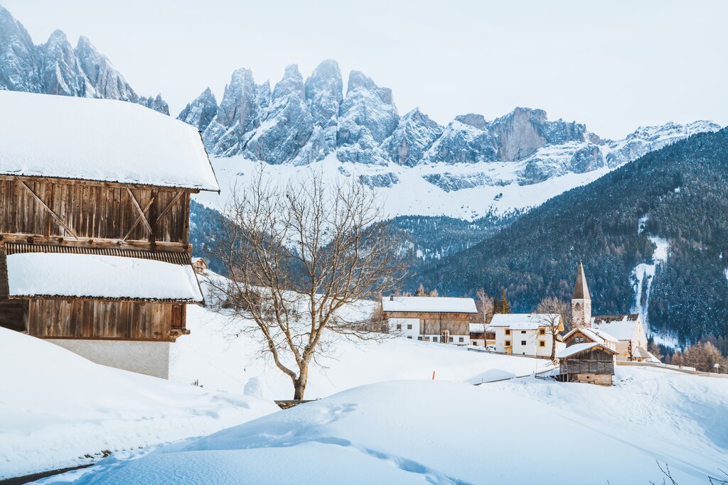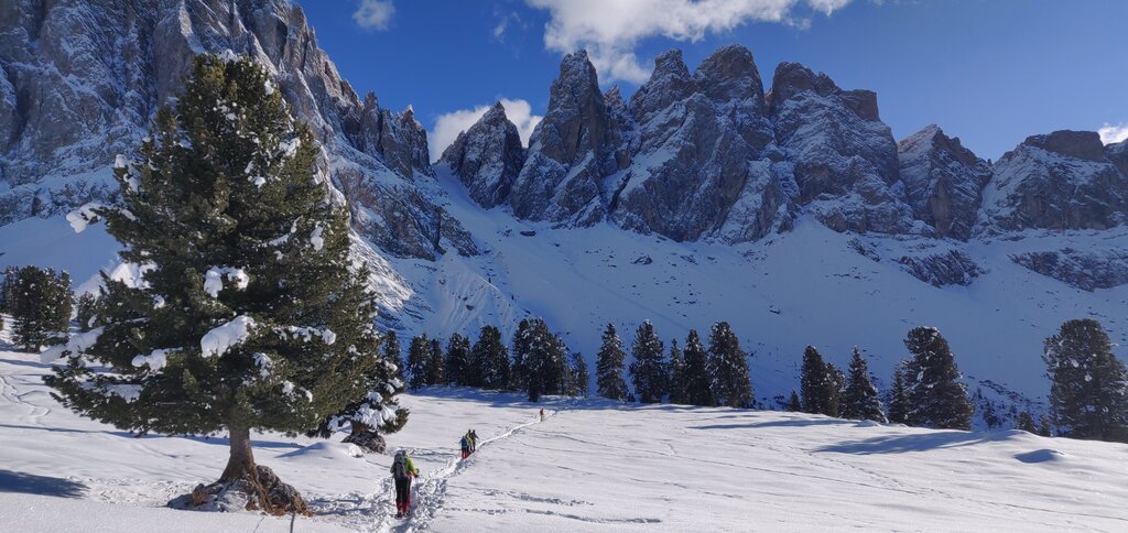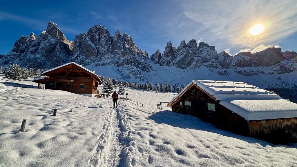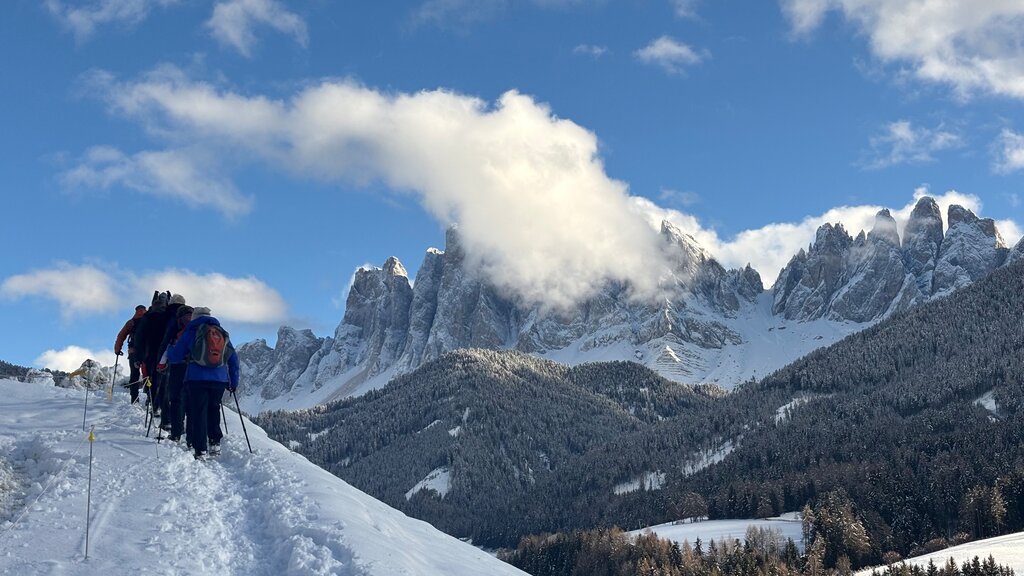<Unsere erste Wanderung führt uns vom idyllischen Villnösstal bis an den Fuß der beeindruckenden Geislerspitzen. Von Zans wandern wir zur Gampenalm (2.062 m) und weiter zur Tschantschenonalm (1.982 m). Das schroffe Profil der Geislerspitzen, das sich markant gegen den Himmel erhebt, gilt als eine der eindrucksvollsten Formationen der Dolomiten. Die klare Winterluft, der knirschende Schnee und die weiten Ausblicke machen diesen Tag unvergesslich. Der Abstieg bringt uns zurück nach Zans.