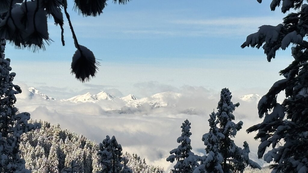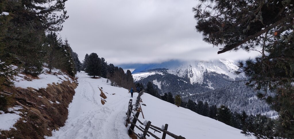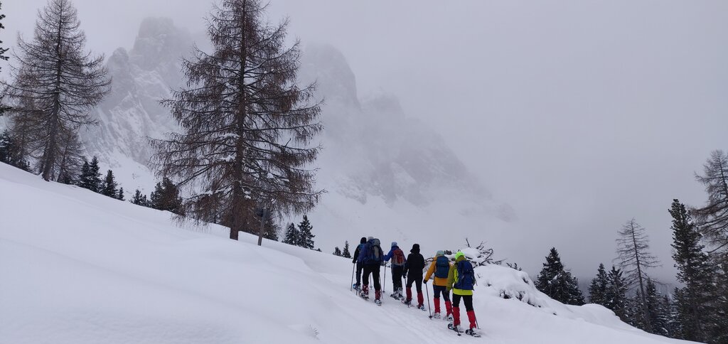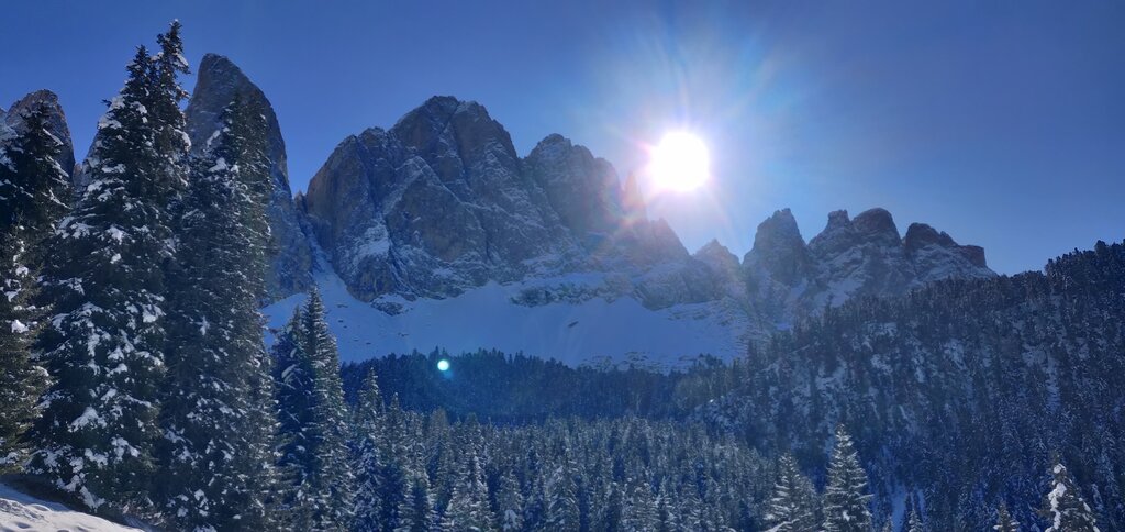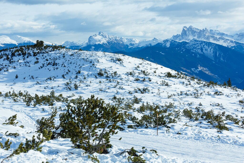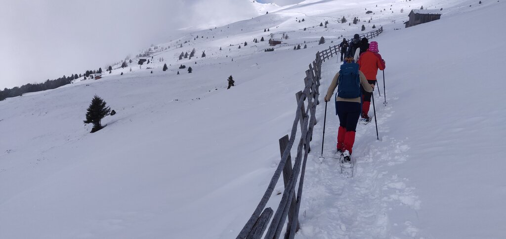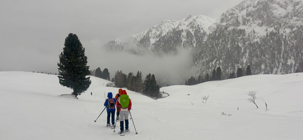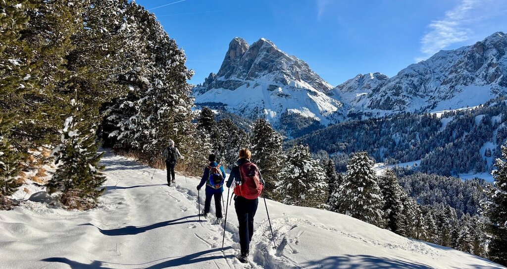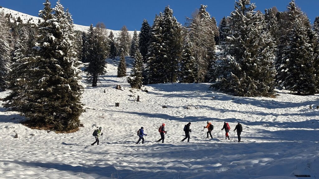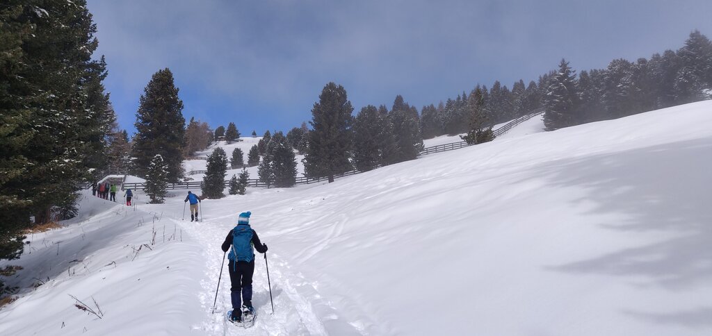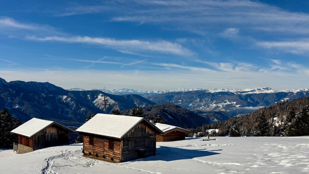 <Ein kurzer Transfer bringt uns nach Feldthurns, das hoch über dem Eisacktal liegt. Am Garner Wetterkreuz beginnen wir unsere heutige Tour, die uns entlang der Hänge des Kühberges führt. Der Weg eröffnet immer wieder weite Ausblicke ins Tal und auf die umliegenden Dolomitengipfel. Zwischen verschneiten Wäldern und sonnigen Hängen genießen wir die klare Winterluft, während unter unseren Schritten der Schnee knirscht.