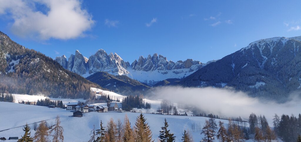 <Von St. Peter in Villnöss wandern wir auf dem Sunnseitnweg, der sich auch im Winter idyllisch bis nach St. Magdalena zieht. Unterwegs begleiten uns immer wieder die für Villnöss so typische Ausblicke auf die anmutigen Geislerspitzen und die Kirche von St. Magdalena. Zum Ausklang dieses genussvollen Tages können wir je nach Lust und Laune in einem der einladenden Cafés einkehren und den Blick noch einmal über das Tal schweifen lassen.