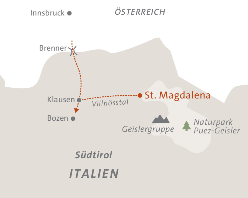 Am Anreisetag um 18:00 Uhr Im Hotel Ranuimüllerhof in St. Magdalena-Villnöß. Bei unerwarteter Verspätung bitten wir dich, über die Telefonnummer +39 0472 840 182 des Hotels mit dem ASI-Bergwanderführer Kontakt aufzunehmen.