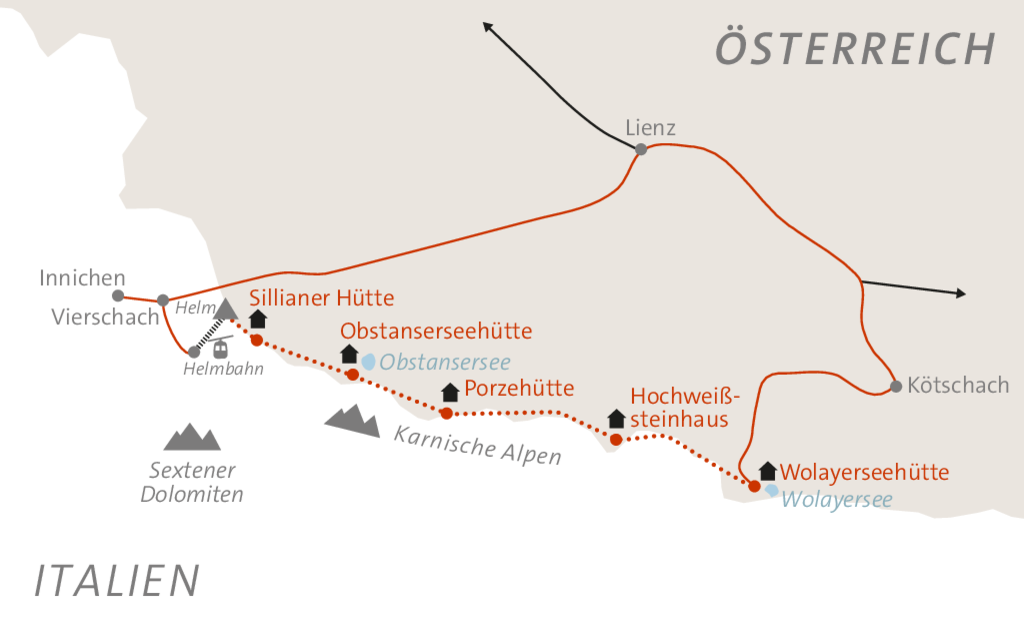 <Von der Sillianer Hütte folgen wir dem Höhenweg westwärts und steigen über sanfte Pfade zur Hollbrucker Spitze (2.580 m) auf. Oben eröffnet sich ein weiter Blick über die Bergwelt – Gipfel, soweit das Auge reicht. Vorbei am glitzernden Hochgränten See führt uns ein Pfad schließlich hinab zur Obstanzersee-Hütte, die uns mit ihrem malerischen Bergpanorama empfängt.