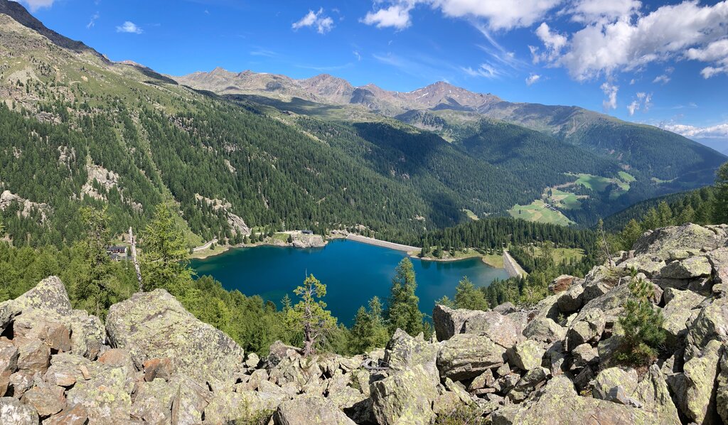 <Am Weißbrunner See in knapp 1900 m Höhe steigen wir zum Kirchbergjoch aufwärts. Die herrliche Panoramasicht von der Passhöhe, mit 2.789 m Höhe der höchste Punkt unserer Woche, reicht zu den eisgepanzerten Gletschergipfeln der Ortlergruppe und zu den Felszacken der Brenta. Unter uns funkeln fotogen die vielen Haselgruber-Seen, an denen vorbei uns der Abstieg zur Haselgruber-Hütte und weiter ins Val di Rabbi führt. Nun sind wir im Trentino.