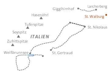 Am Anreisetag treffen wir uns um 18:30 Uhr im Hotel Unterpichl, St. Walburg, Unterpichl, 39016 Ulten. Tel: +39 0473 795479.