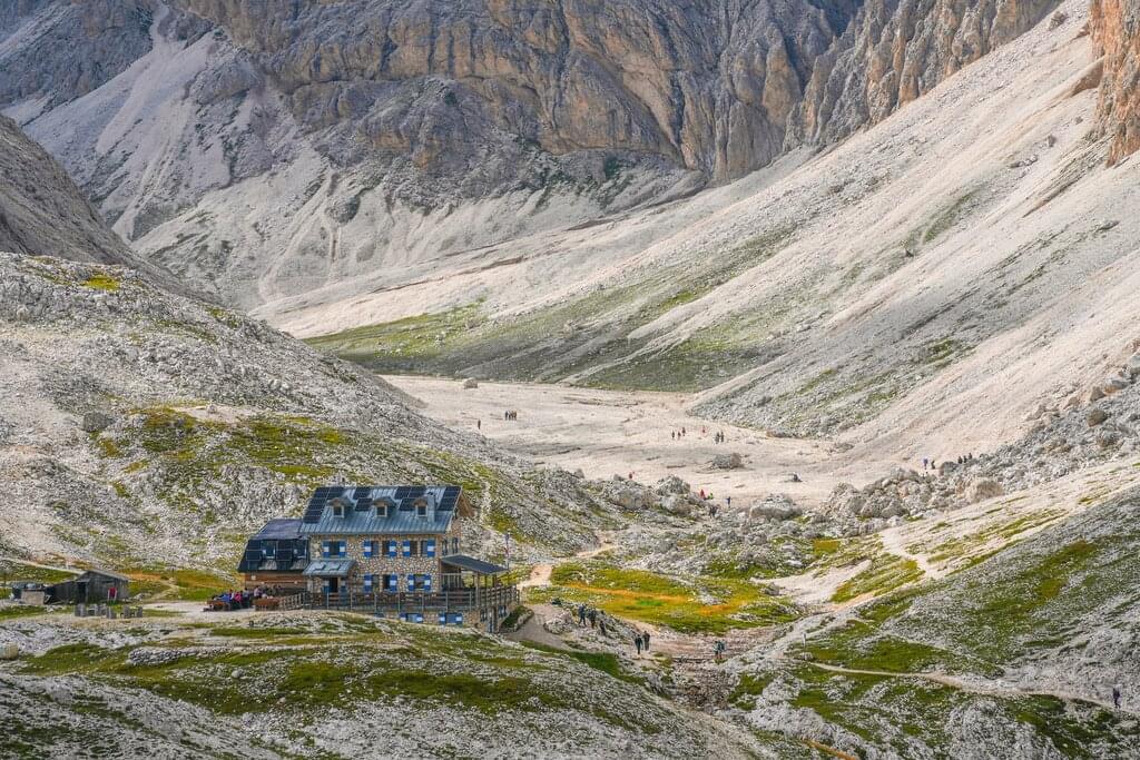 <Dieser Weg begeistert – von der Hütte zum Passo di Dona (2.516 m). Abstieg ins Valle di Duron zur Malga Docoldaura (2.046 m), dann Aufstieg über das Mahlknechtjoch (2.187 m) zur Tierser Alpl Hütte (2.440 m). -